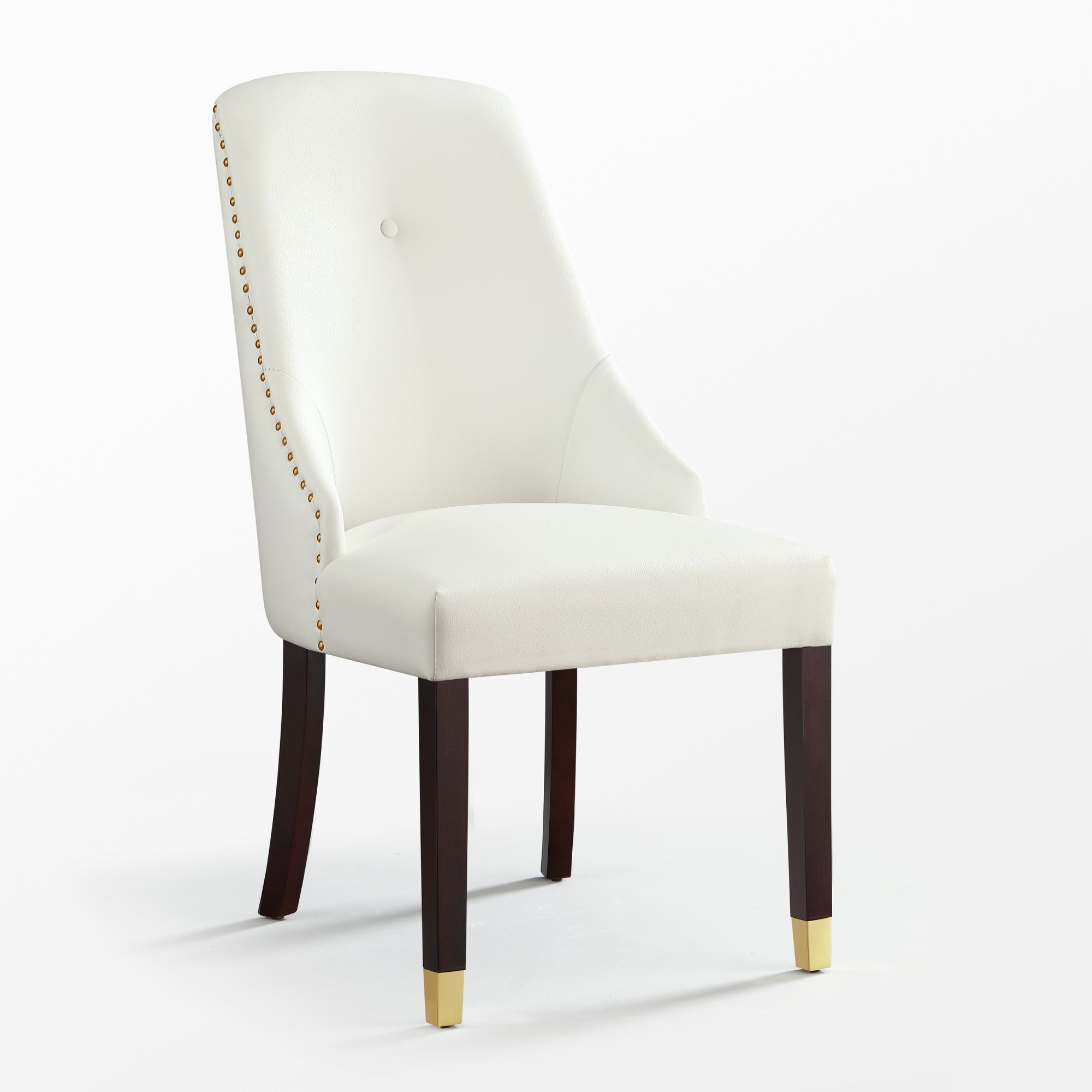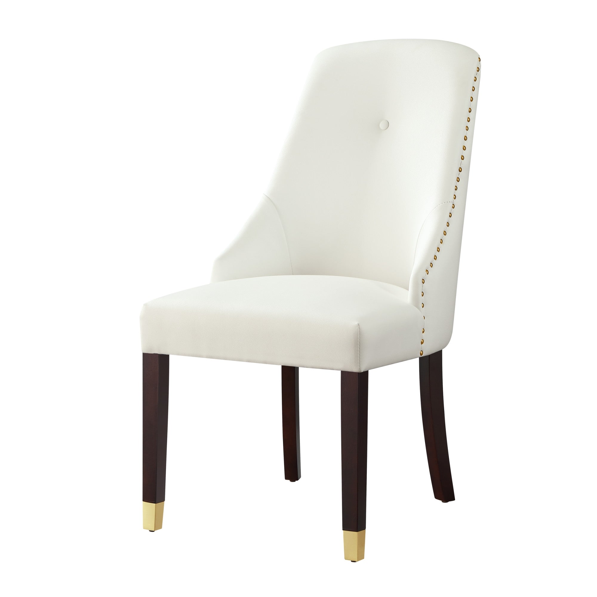 - Traditional white side chair set with solid wood legs and upholstered button tufted seating.
