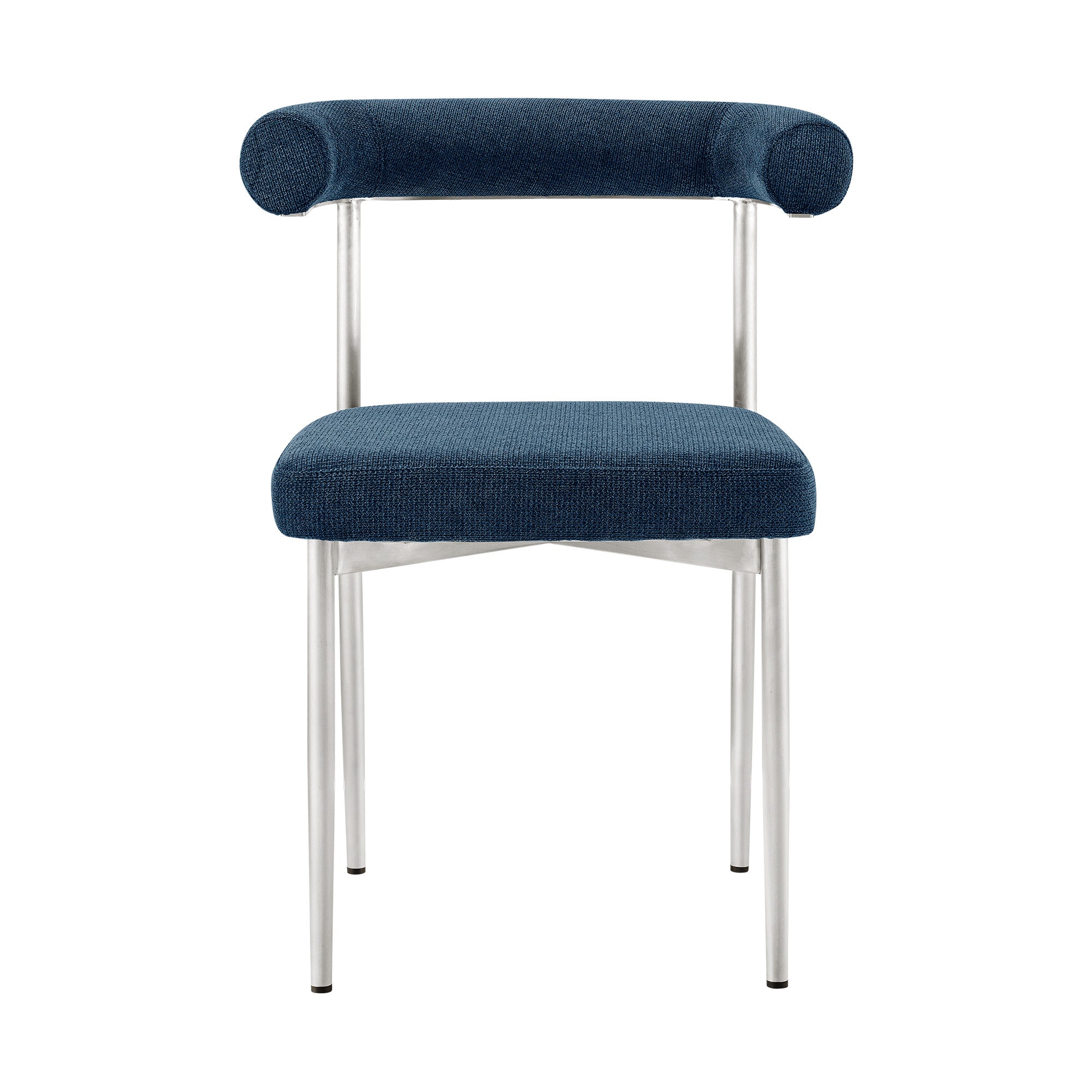 - Upholstered dining chair with stainless steel frame.