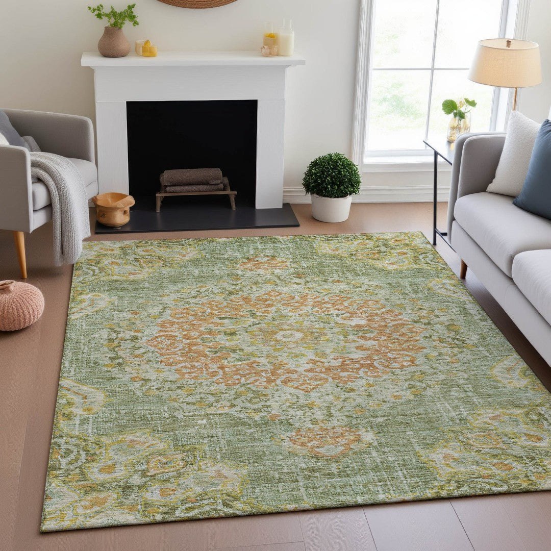 Bring warmth and timeless elegance to larger living spaces with this artichoke green, copper, and gold floral area rug. Designed for busy homes, it balances classic style with practical performance—easy to clean, fade-resistant, and durable—so it creates a striking focal point while standing up to kids, pets, and everyday use.
