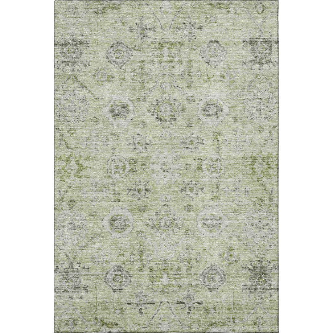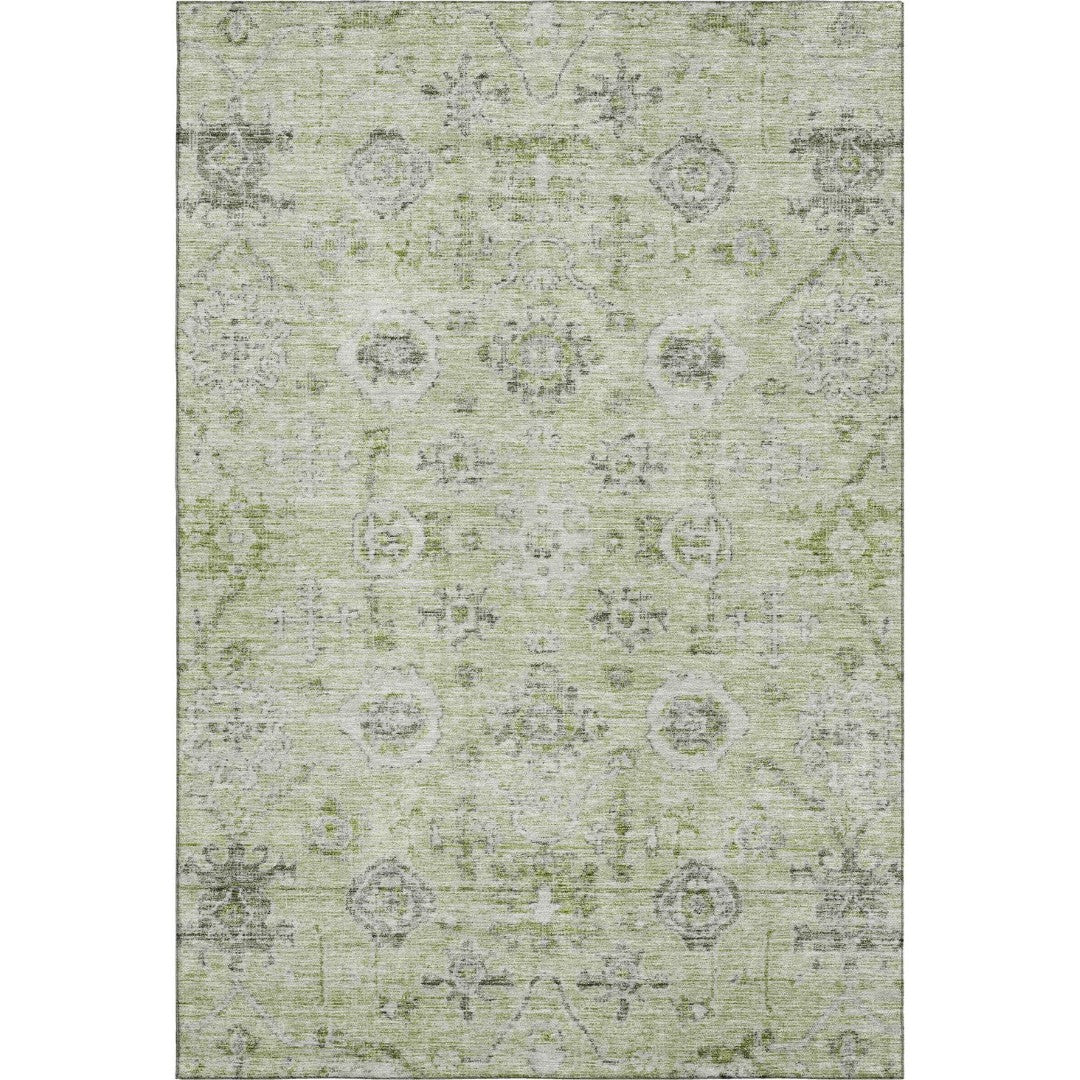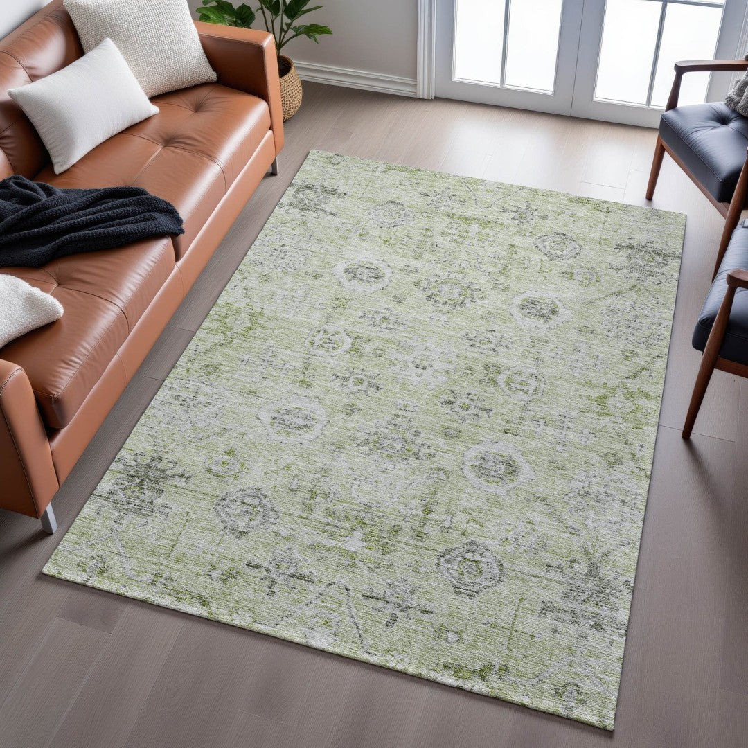Add timeless elegance and practical durability to large living spaces with this washable damask area rug. Its artichoke green, gray, and silver palette brings a refined, layered look while performance features—stain resistance, UV protection, and a secure felt backing—make it ideal for busy homes with children and pets. Designed for long-lasting appeal, the rug balances classic style with easy maintenance to create a standout focal point in dining rooms, living rooms, or family areas.