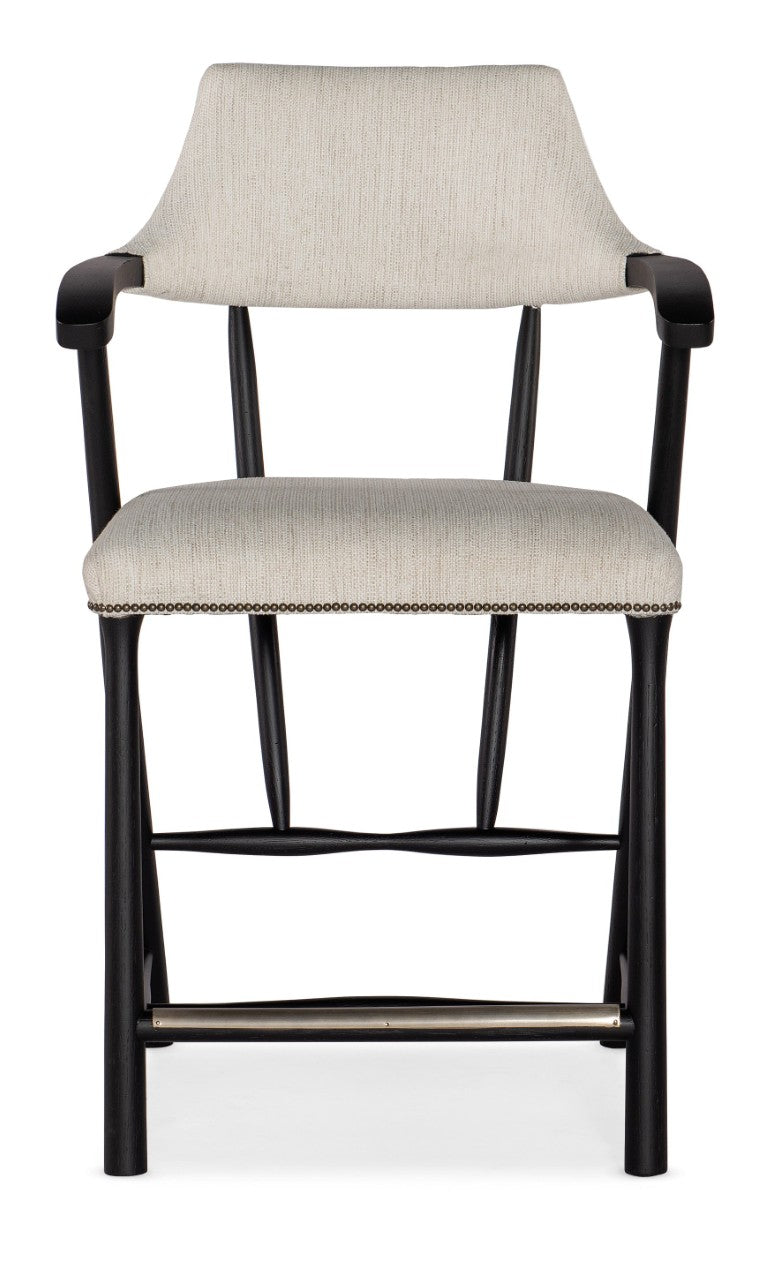 Elevate your kitchen or bar with the Linville Falls Stack Rock Counter Stool — a refined blend of organic texture and modern craftsmanship. Its upholstered seat and supportive back in neutral Remington Porcelain fabric pair with a sculptural wood frame and curved armrests finished in deep Shadow for an inviting, contemporary look. Thoughtful details like nailhead trim and a metal-covered footrest deliver both style and comfort, making this stool a versatile choice for casual or upscale interiors.