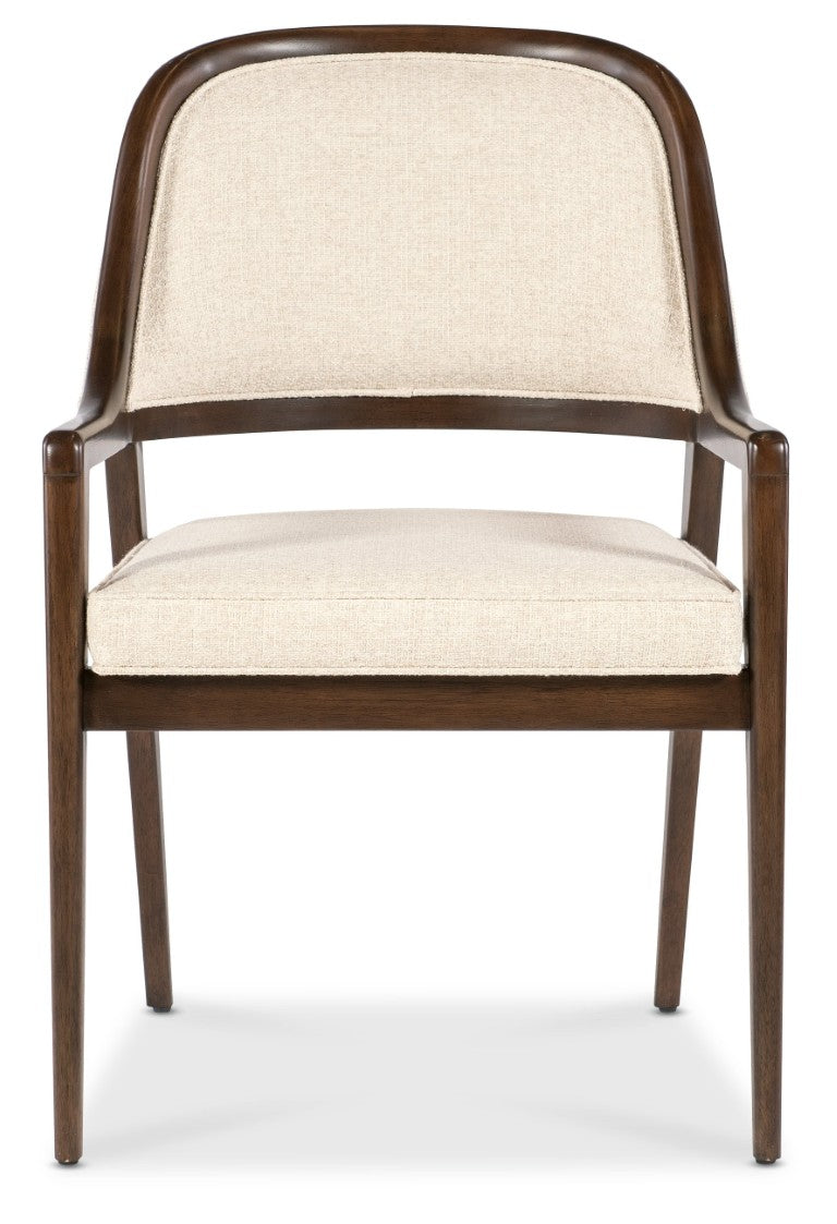 The Archives Upholstered Arm Chair is a refined dining chair that blends contemporary lines with classic craftsmanship. Thoughtfully scaled for formal dining rooms, it pairs figured walnut veneers and a rich wood finish with durable performance upholstery for a look that feels both curated and comfortably lived-in.