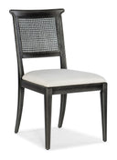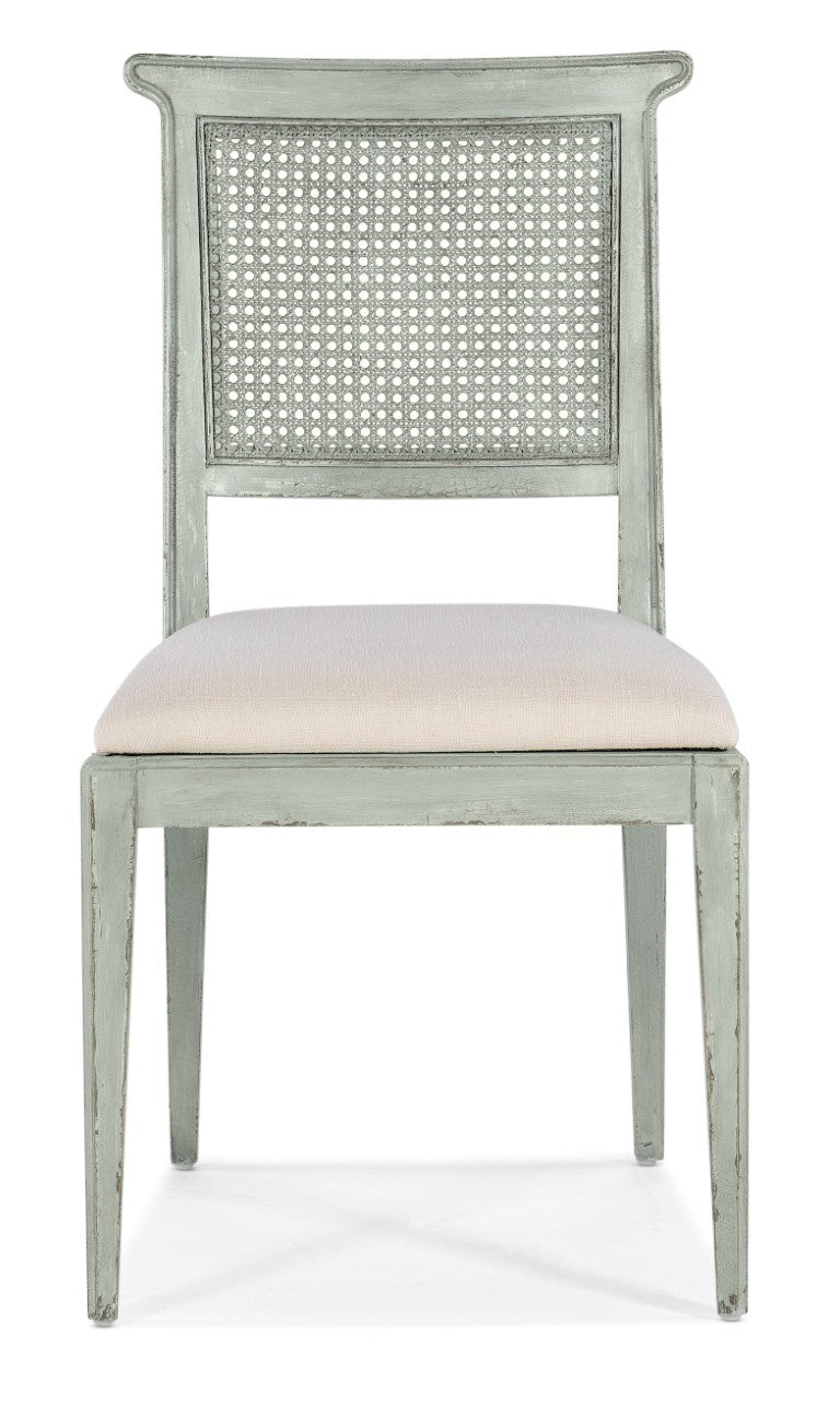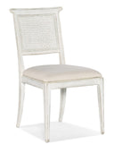 Evoking the relaxed elegance of West Indies craftsmanship and the refined details of British and Dutch Colonial design, this side chair blends woven cane, soft upholstery, and a weathered Magnolia White finish for a timeless dining accent. Its oyster-colored fabric seat and cane back offer comfortable support and breathable style, while distressed detailing and practical floor glides make it both decorative and functional for everyday use.