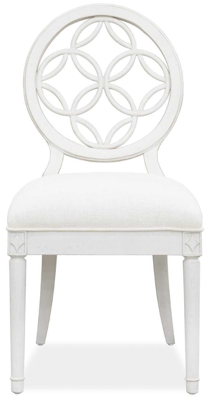 Bring a touch of casual elegance to your dining space with the Brynlee Side Chair. Its lace-like interlocking circle fretwork back adds visual interest while the cushioned linen-blend seat ensures comfortable gatherings. The creamy white finish with subtle distressing creates a relaxed yet refined look that pairs well with both traditional and transitional décor.