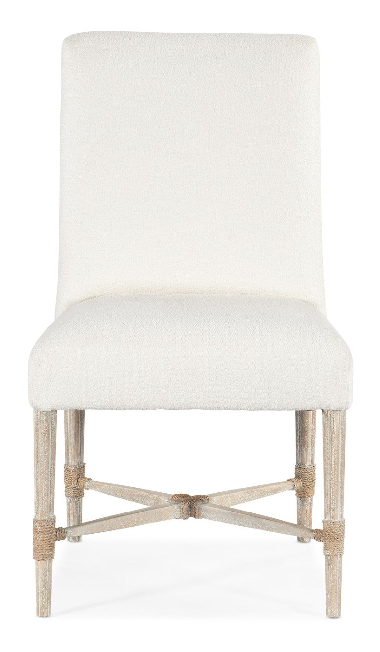 Relaxed and refined, this side chair blends coastal charm with crafted details to create a welcoming seat for dining rooms, patios under cover, or casual living spaces. Upholstered in Macrame Arctic fabric, the Serenity Side Chair pairs a comfortable cushion and supportive back with Beech wood construction, rope-wrapped arms, and a distinctive X stretcher base for both stability and style.