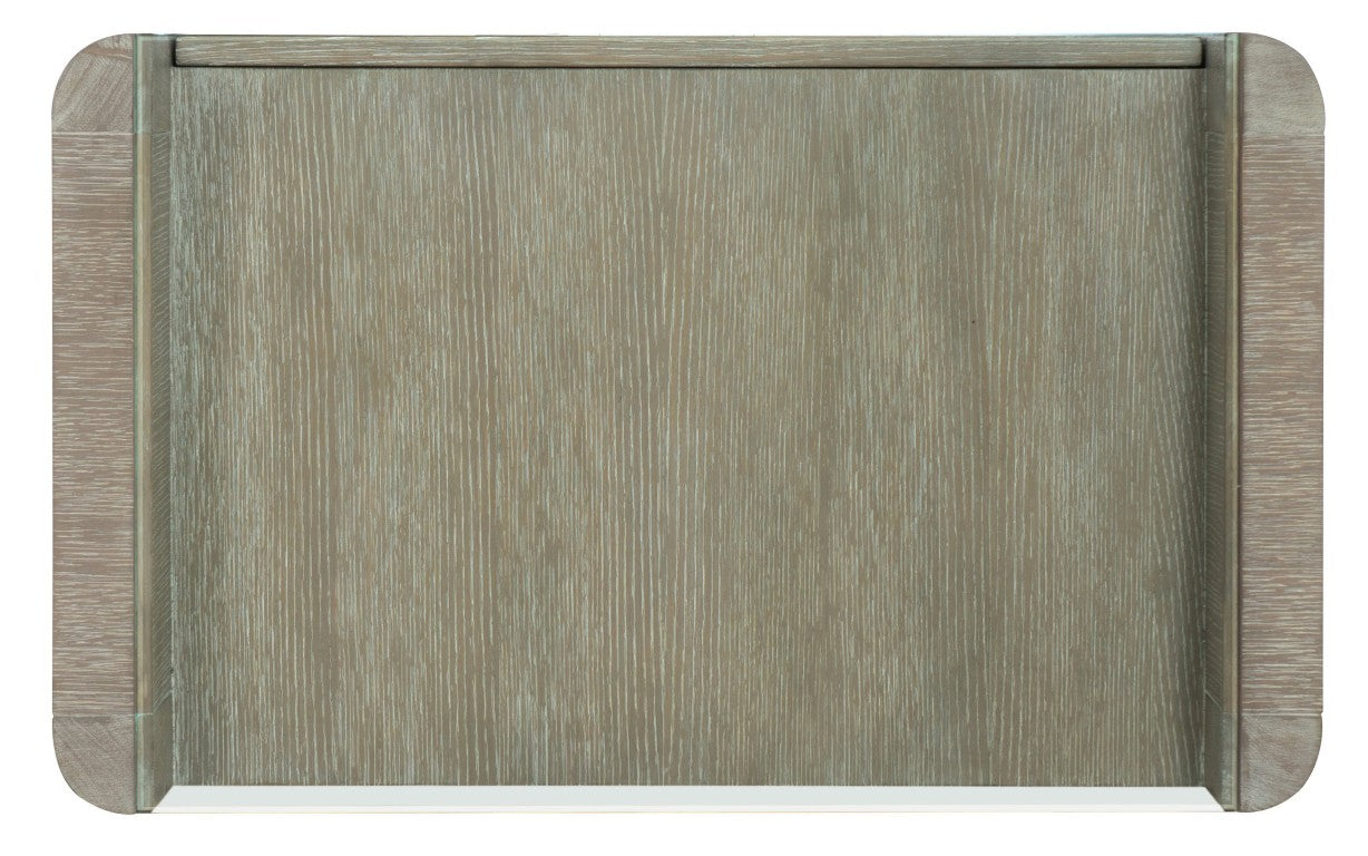 Soft, rounded forms combine with sand-blasted greige and antique white finishes to create an inviting transitional boutique collection in Affinity. The main finish for the 20-piece collection of bedroom, dining room, occasional, accents and home entertainment is a wire-brushed greige (gray/beige) on quartered white oak. Pewter and antique white hardware and soft linen fabrics add intrigue.