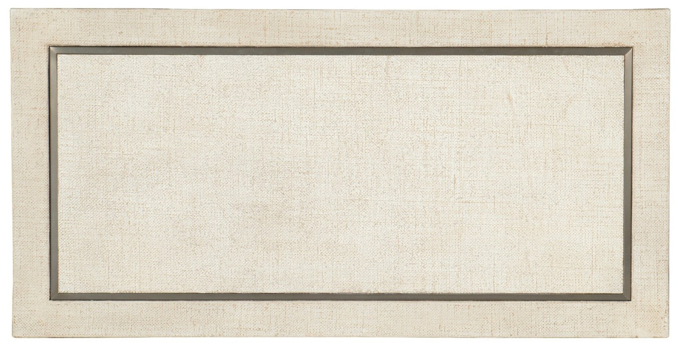 - Pebble Beach: lacquered burlap finish. Champagne colored metal inlay around top, middle shelf and bottom shelf.