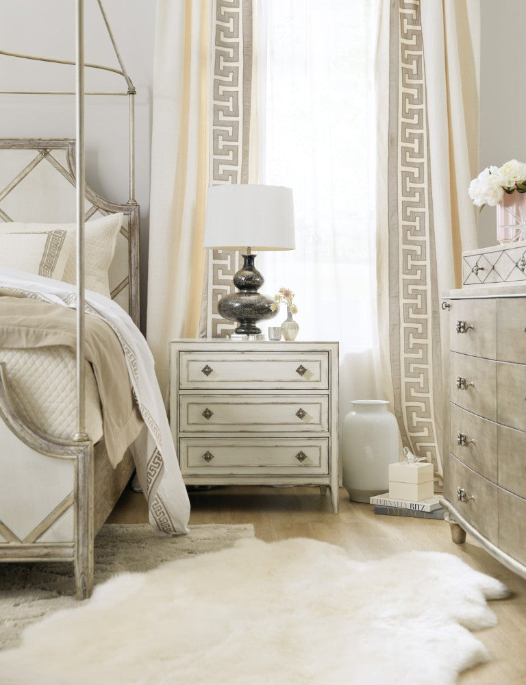 Channeling jet setting socialites from the golden age of Hollywood as its muse, Hooker Furniture is set to launches a major expansion to its popular Sanctuary collection. The bedroom, dining room, occasional and home office pieces are grouped into three unique new personas, each of which embody the influences of the iconic starlets whom left impressions of glamour, charm and class on American pop culture. From bold and dramatic to soft and romantic to a statement-making eclectic lifestyle, the three personas – Collette, Anastasie and Diamant – effortlessly bring to life a well-traveled socialite who has curated a collection of home furnishings in her metropolitan home that tell the story of her travels across the globe. Anastasie offers a softer, romantic look with its creamy white finish that is accented with champagne and silver tipping. Several historical reproduction styled pieces in a two-tone finish are intermingled throughout, giving the group a bit of a traditional European cottage style. Additional design details include table tops with intricate quatrefoil veneer patterns crafted with oak and a mix of unique walnut inlay, carved chairs with acanthus leaf and scrollwork detailing and champagne tipped eglomise.