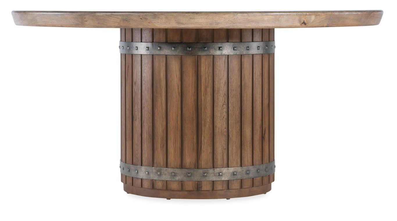 Bring casual wine-country charm to your dining space with this beautifully crafted round table. Designed to evoke the look of a rustic wine barrel, the Vineyard Row Dining Table pairs a light, Sonoma-finish top with a richer Napa-finish base, creating an inviting two-tone aesthetic that complements both relaxed and refined interiors. Built from Pecky Hickory with distressed detailing and hammered metal accents, this table blends durable construction with authentic character—perfect for family meals, entertaining, or cozy gatherings.