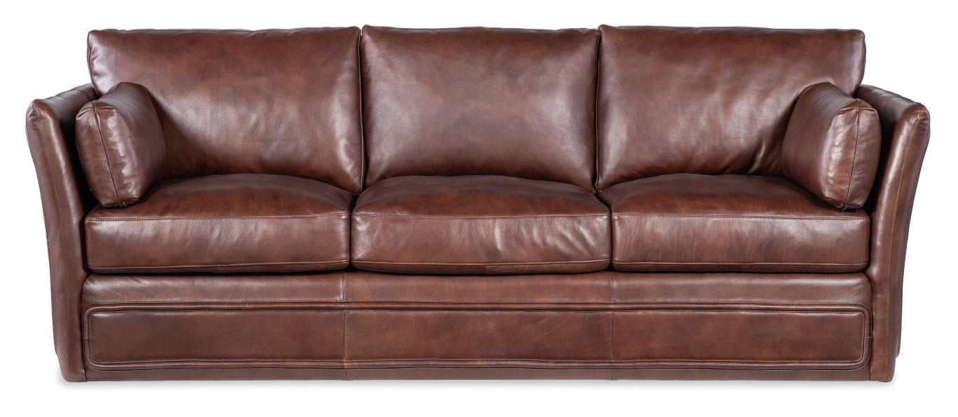 Elevate your living room with the Woodstock 3-Seat Sofa — a beautifully scaled, traditionally styled piece that blends refined craftsmanship with everyday comfort. Its flared arms and tailored details create an elegant silhouette, while the semi-aniline top-grain leather upholstery offers a supple, luxurious feel that ages gracefully. Thoughtful accents like the matching pillows and decorative panels give this sofa a finished, cohesive look suitable for formal or transitional interiors.