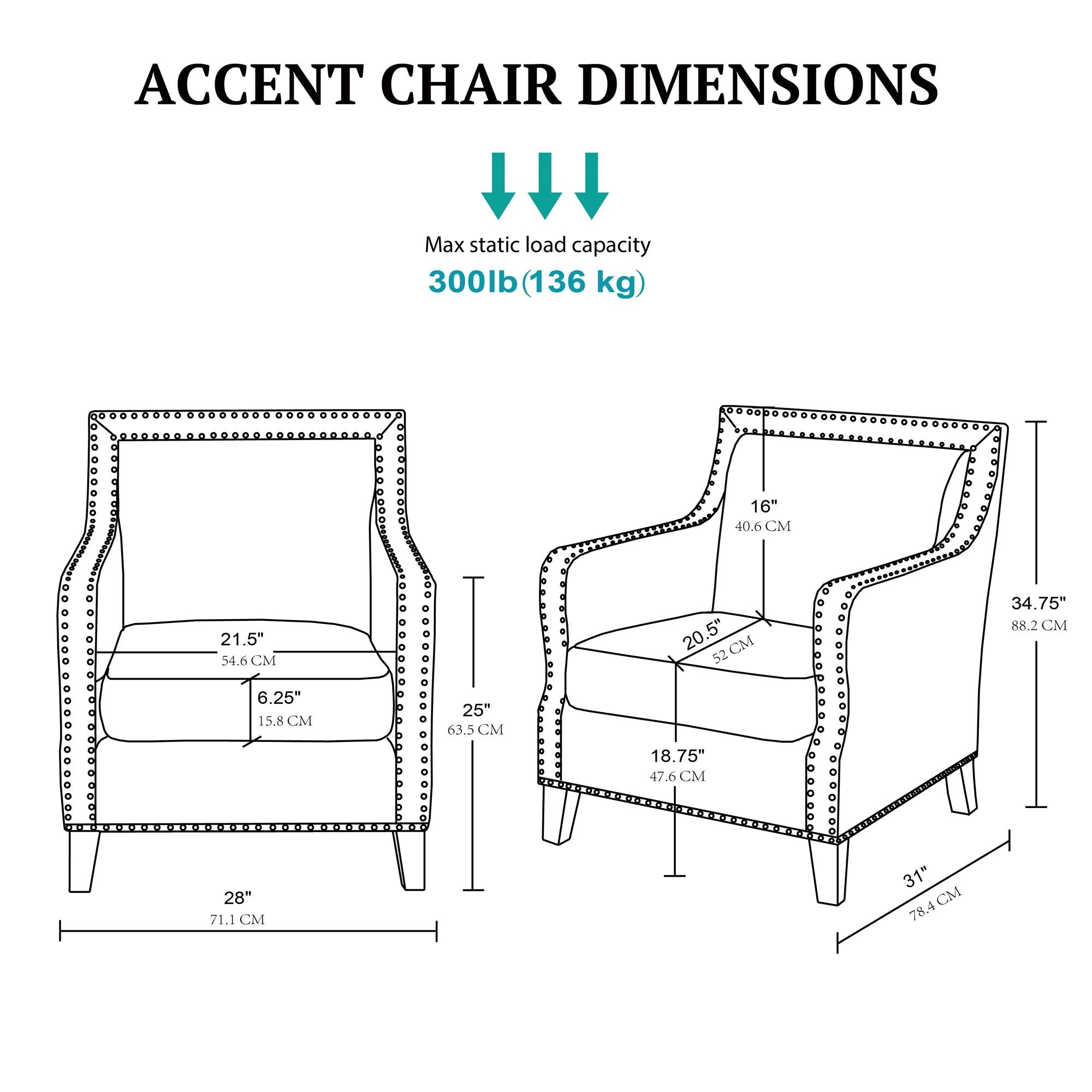 - One Size 1 Chair:28"W x 31"D x 34.75H" Seat:21.5"W x 20.5"D x 18.75"H Seat Cushion Thickness:6.25" Arms:21.5"W x 25"H Front Legs Upper:2.36"W x 2.36"H Front Legs Bottom:1.57"W x 1.57"H Front Leg Height:5.25" Back Legs Upper:2.36"W x 2.36"H Back Legs Bottom:1.57"W x 1.57"H Back Leg Height:5.25" Back Rest:28"W x 16"H Maximum Weight Capacity (Seating):300LB