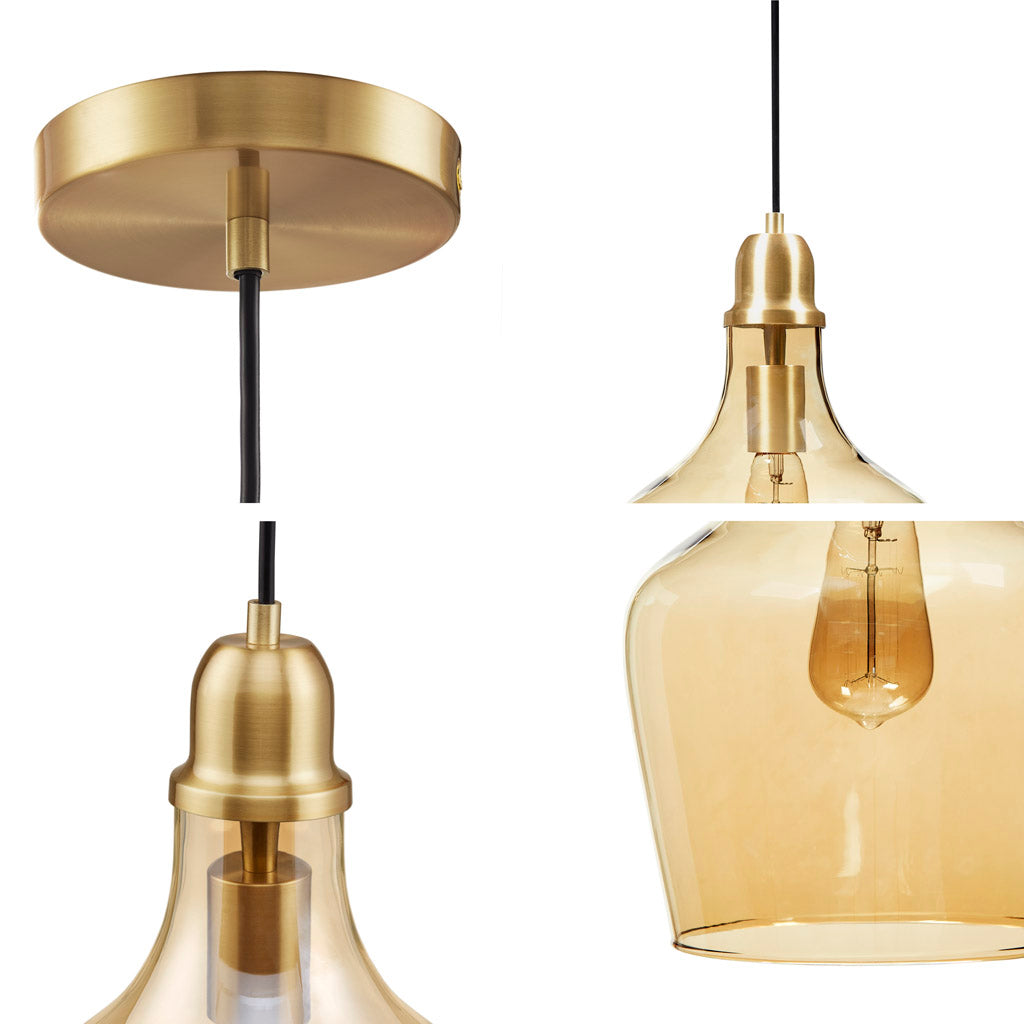 - Material: Clear hand-blown glass shade with gold-finish metal canopy and hardware