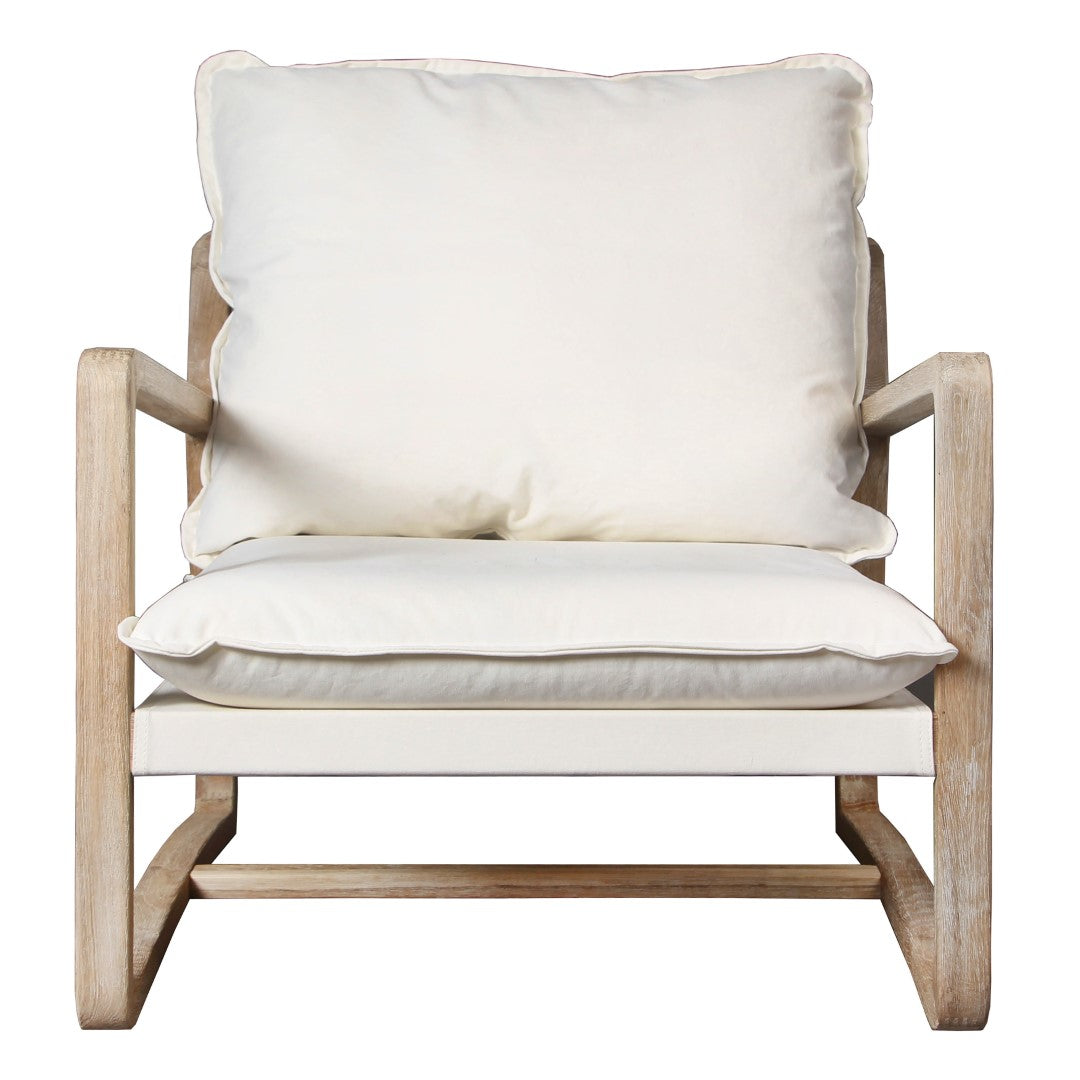 - Short Description: MODERN CASUAL LOUNGE ACCENT CHAIR MADE FROM SOLID OAK IN A BLEACHED FINISH WITH A SAND COTTON BLEND FABRIC UPHOLSTERED PILLOW STYLE SEAT AND BACK