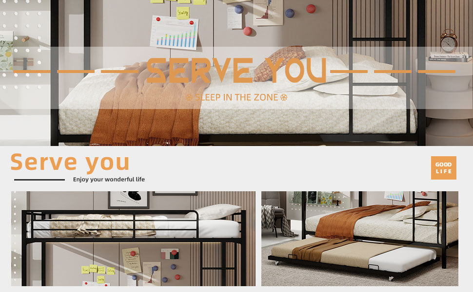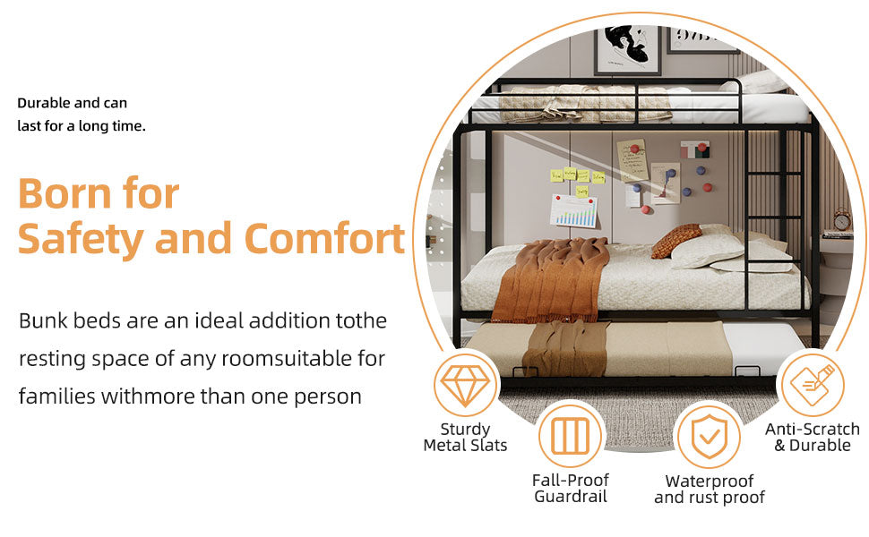 - This metal bunk bed with a trundle features a sturdy frame structure. The trundle can be easily pulled out for extra sleeping space, ideal for accommodating guests or maximizing room functionality, and it fits well in various living spaces like dorms and family homes.