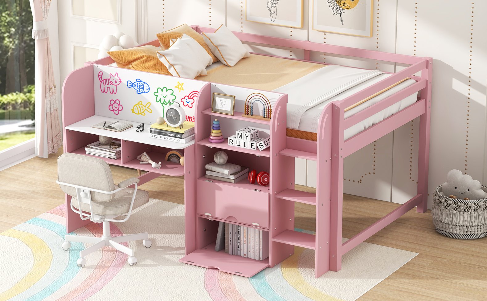 Maximize bedroom space with this stylish and practical low loft bed designed for functionality and fun. Ideal for growing kids and teens, it combines a sturdy sleeping area with an integrated study zone, ample storage, and a playful whiteboard for doodling or notes—making it a complete, room-saving solution that keeps everything organized and accessible.