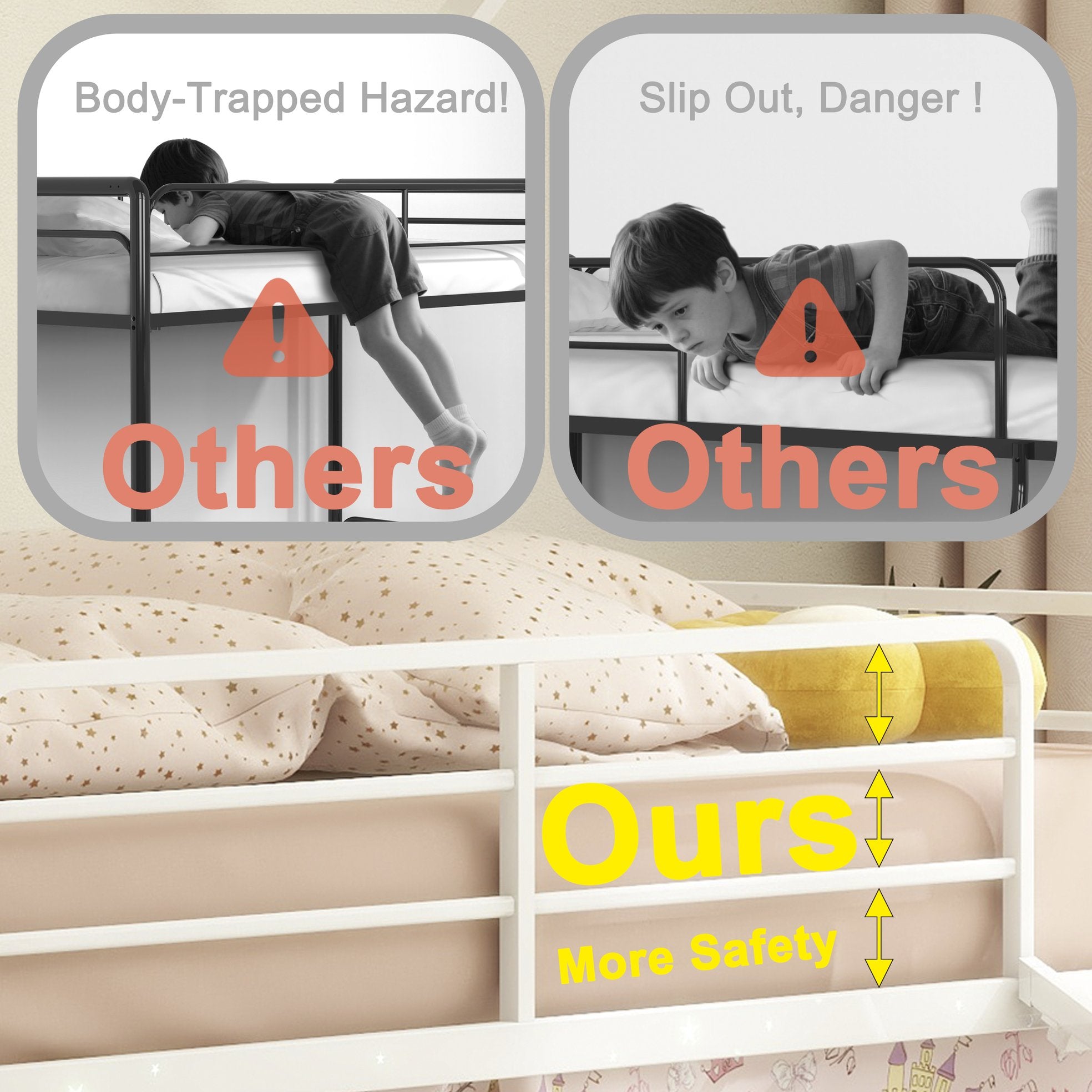 - [Kid-Friendly Safety Haven]: Our bunk bed is a haven of safety and comfort, tailored for kids. It boasts a fully sealed slide to prevent any body parts from getting caught, smooth edges for safe climbing, and a spacious under-bed area that avoids head bumps. This thoughtful design ensures a secure and enjoyable environment for children to play and rest.