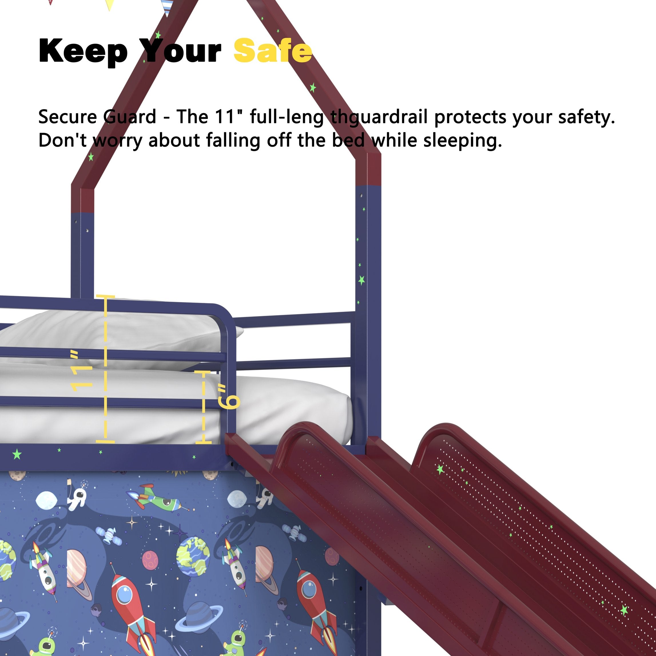 - Secure guardrails: Full-length upper guardrail plus narrow-gap design to prevent falls and avoid limb entrapment while sleeping or playing.