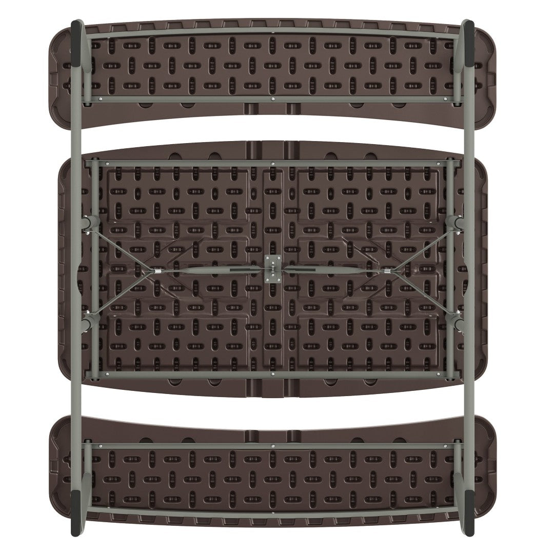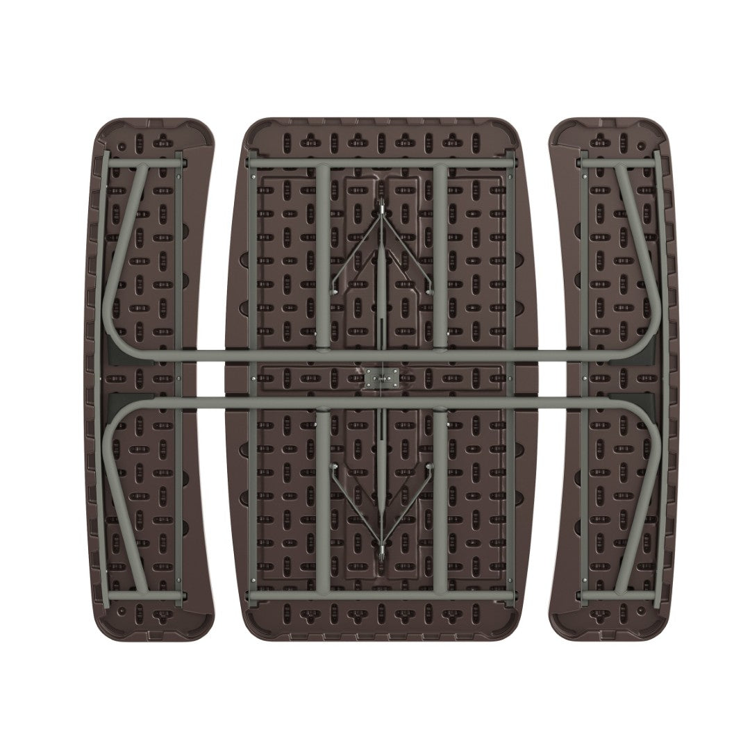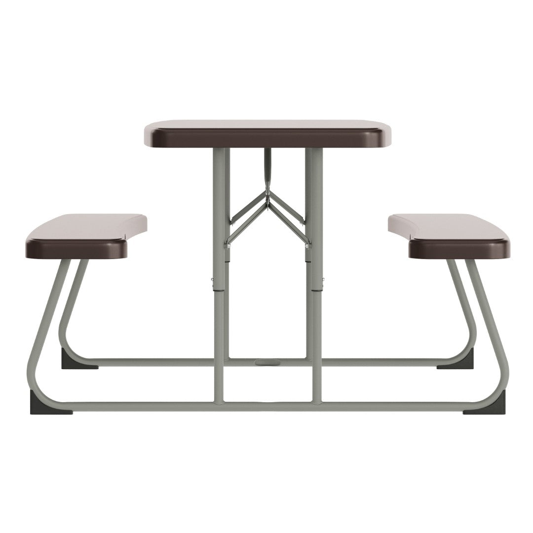 - Durable brown polyethylene tabletop and bench seats that are waterproof, stain-resistant, and impact-resistant for everyday use
