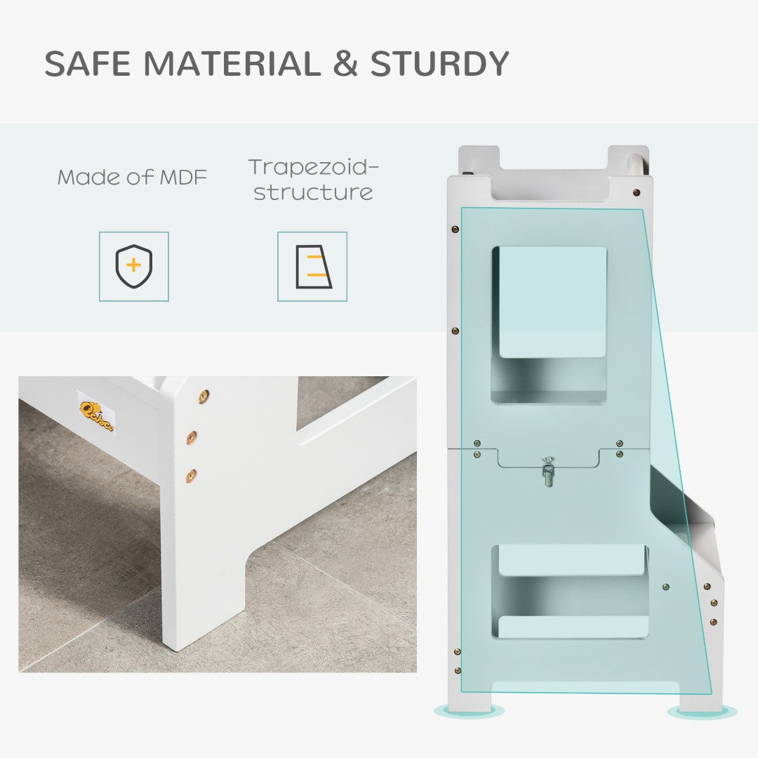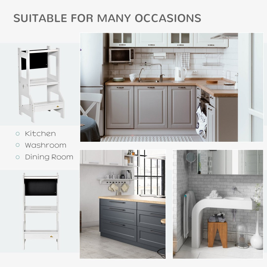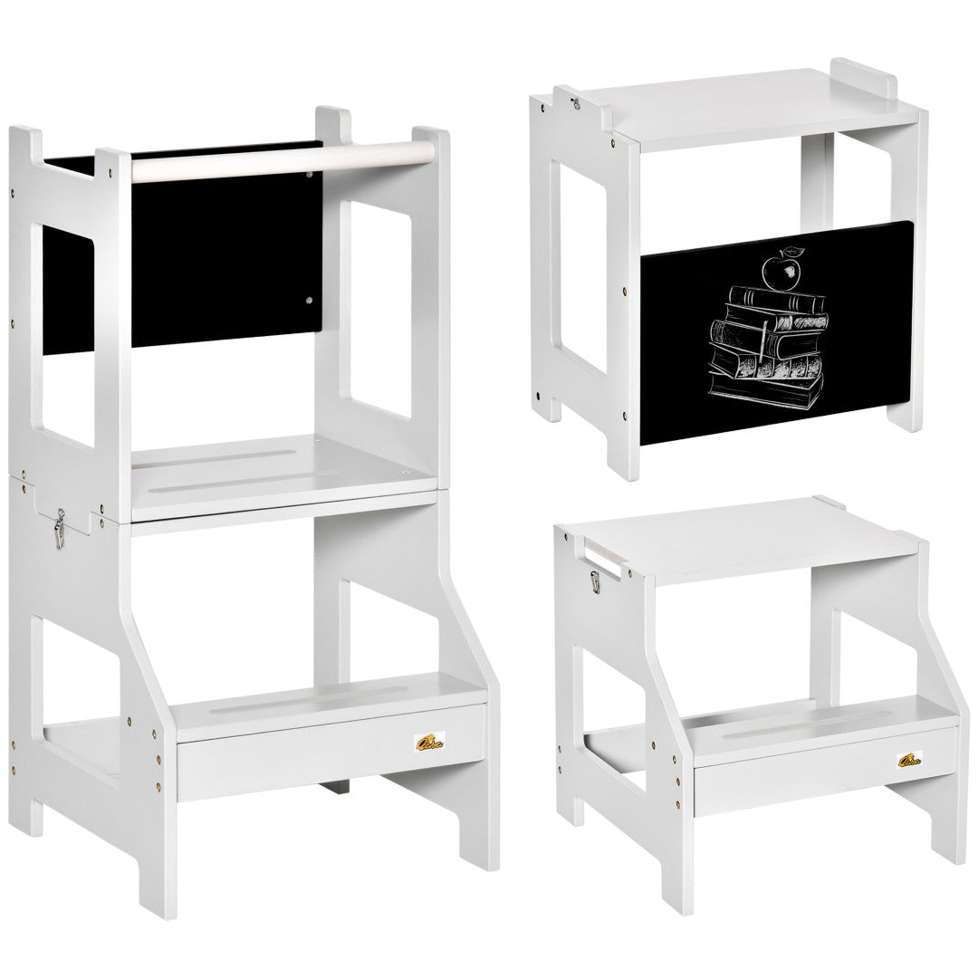 Engaging Description: Let your child join in with confidence—this versatile 2-in-1 toddler kitchen step stool and table set is designed to promote independence, creativity, and safe participation in everyday activities. Built from durable MDF with a neutral off-white and gray finish, the set converts from a secure learning tower into a compact table and chair, and includes a chalkboard surface for drawing and imaginative play. Thoughtful safety features and solid construction make it ideal for kitchen, bathroom, or bedroom use for preschoolers.