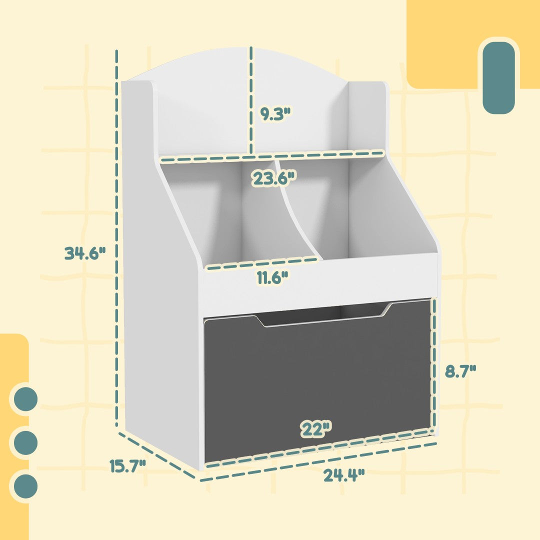 - Storage Solution: This kid's bookshelf and toy storage solution features an open shelf, two storage grids, and a large bottom drawer, offering ample space for books, toys, and much more.