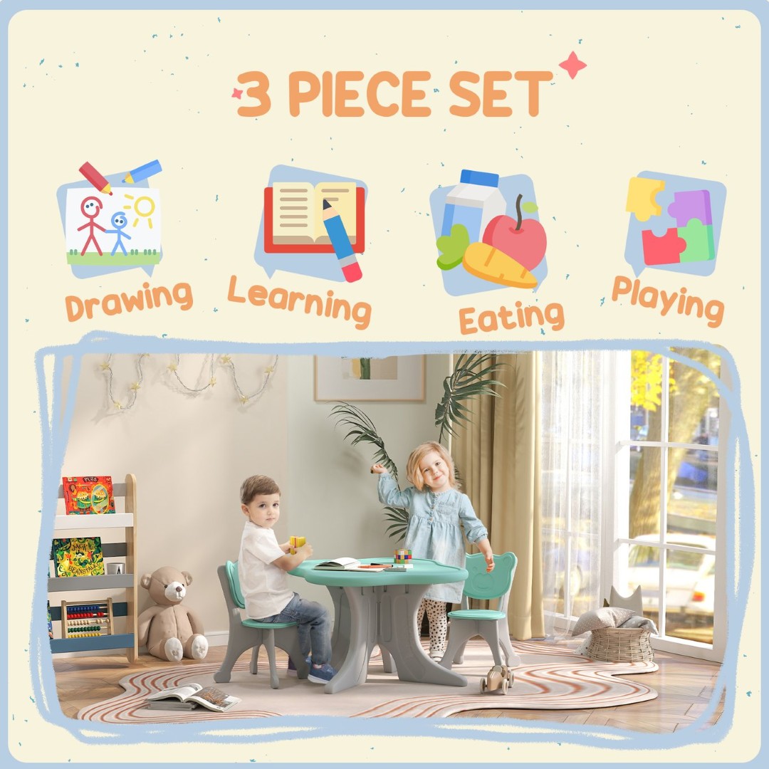 - Included pieces: 1 square table and 2 matching chairs with bear-shaped backrests—perfect for two children to share activities.