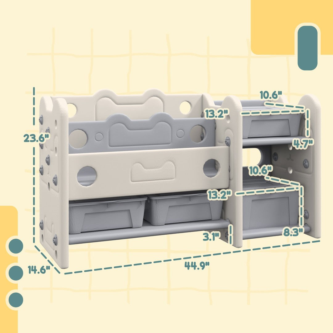 - Spacious and Organized: Have a playroom storage solution. Our kid's toy storage organizer features ample space and designated areas to keep toys neat, including bookshelves, four storage boxes, and a rack.