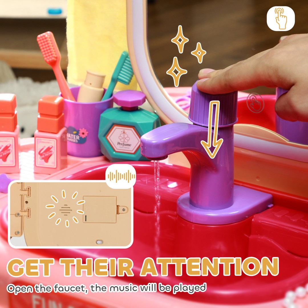 - Interactive Features: Equipped with an LED light mirror, this girl's vanity set also features a manually operated faucet with music for realistic water play (when you pour in water ahead of time).