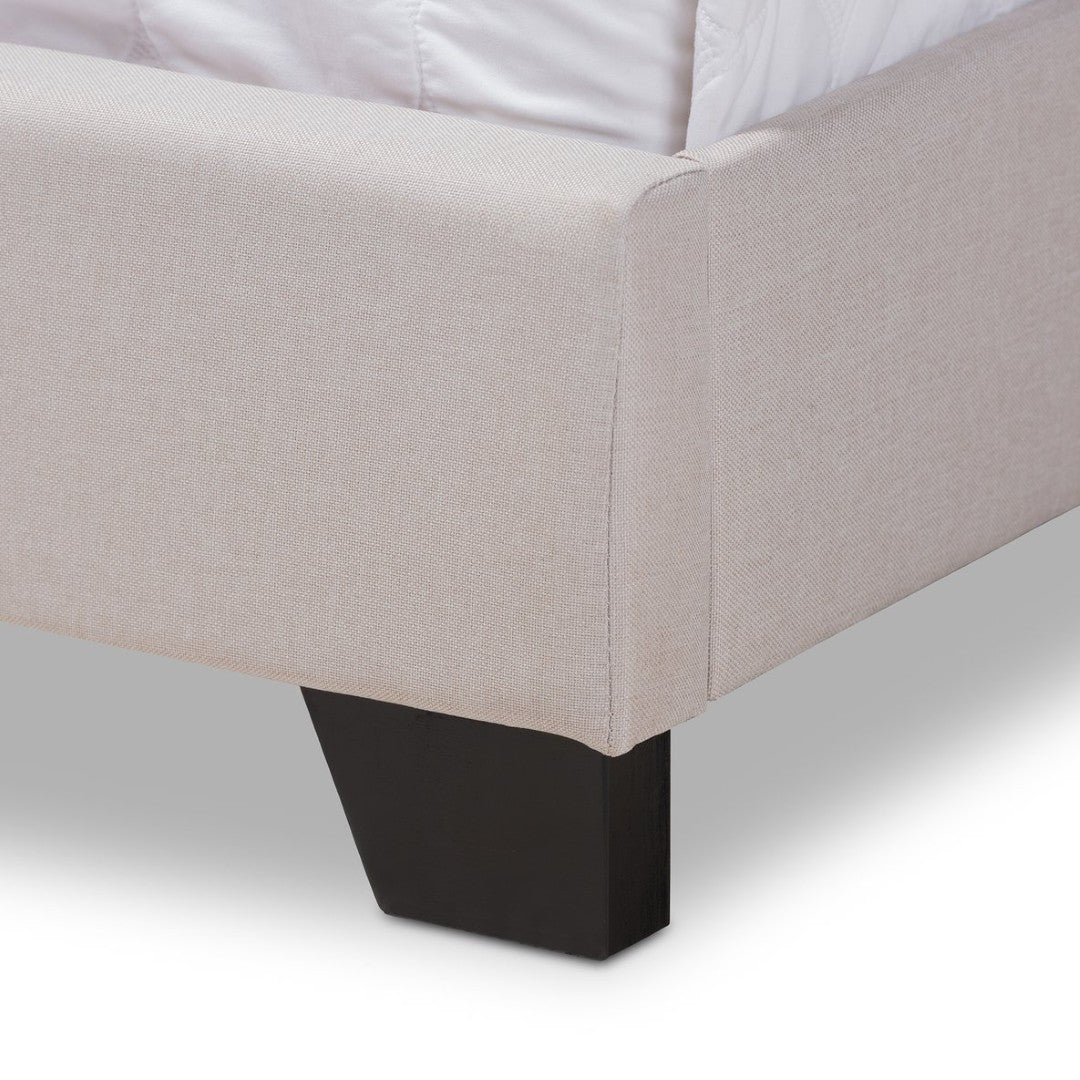 Bring modern elegance and hotel-style comfort to your bedroom with this contemporary upholstered king bed. Clean lines, winged headboard details, and subtle button tufting create a refined focal point, while durable rubberwood and poplar construction ensures long-lasting support. Finished in neutral beige polyester fabric with black feet and chrome nailhead trim, this bed pairs easily with a variety of décor and requires a box spring and mattress for proper setup. Made in Malaysia and shipped via freight; assembly required.