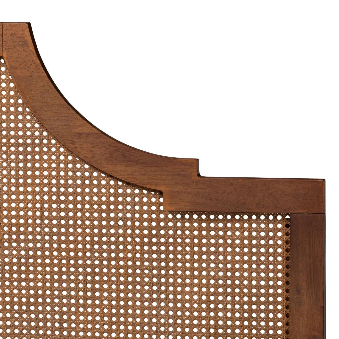 - Construction & materials: Solid rubberwood and engineered wood frame finished in ash walnut tone; woven synthetic rattan headboard for durable, textured visual interest