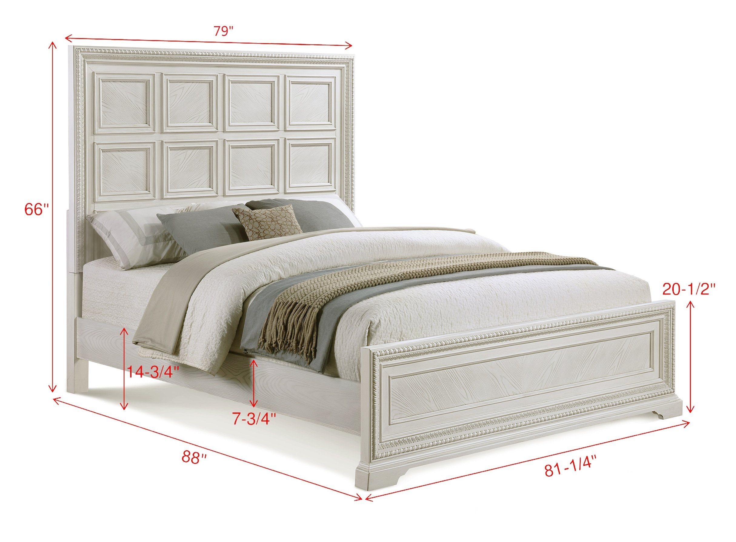 Bring timeless elegance and architectural charm to your bedroom with this king-size headboard panel bed in an antique white finish. The bright, neutral color opens and lightens any space while the geometric paneling creates a strong focal point that complements both traditional and transitional décor. Designed for presence and practicality, this piece is sold as the king bed only and requires simple assembly.