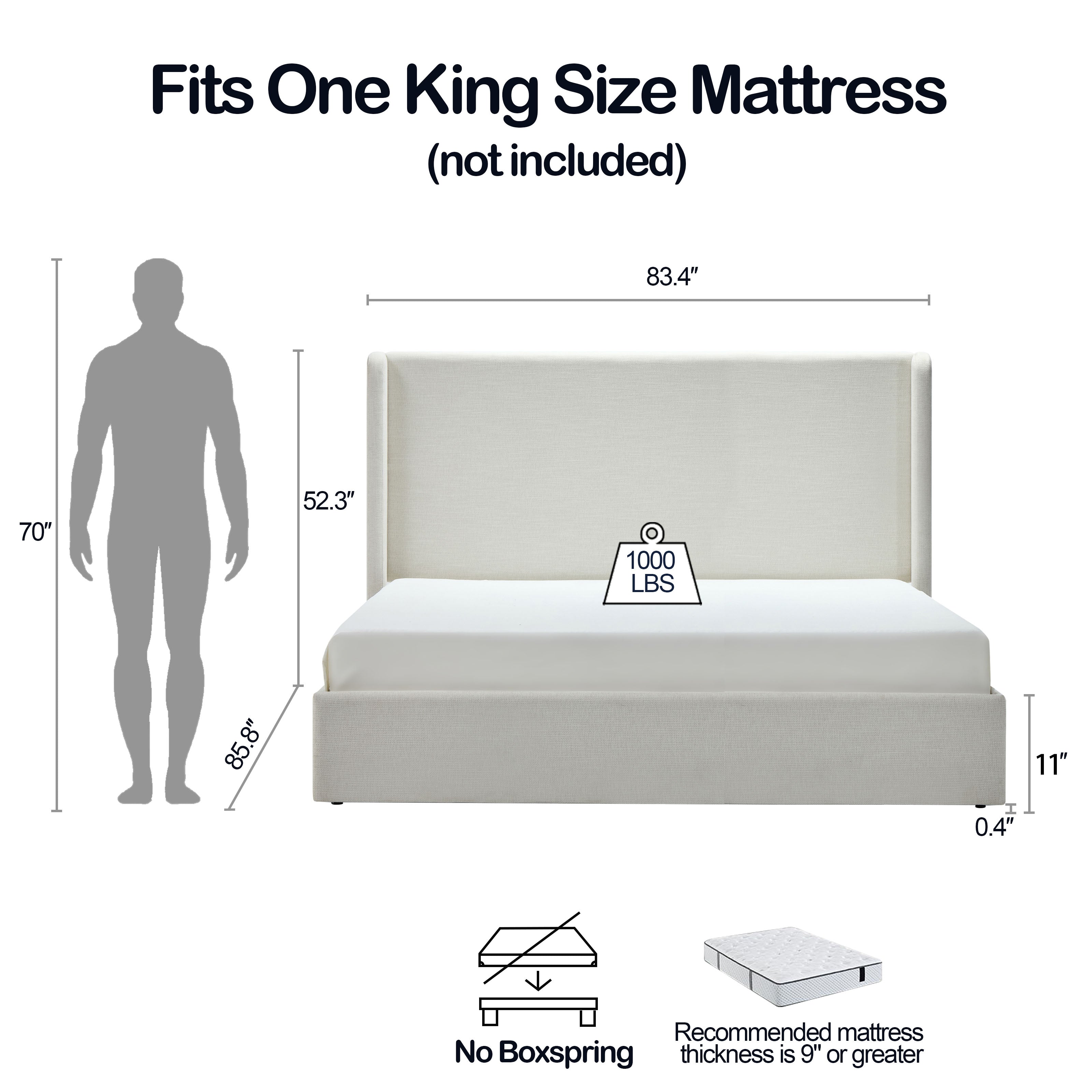 Give your bedroom a modern, minimalist upgrade with this upholstered wingback platform bed. The tall, gently curved headboard and textured ivory chenille fabric create a chic, welcoming focal point while the sturdy slatted base and metal side rails deliver reliable support—no box spring required. Designed for easy assembly and long-lasting, quiet performance, this bed blends elegant form with everyday function.