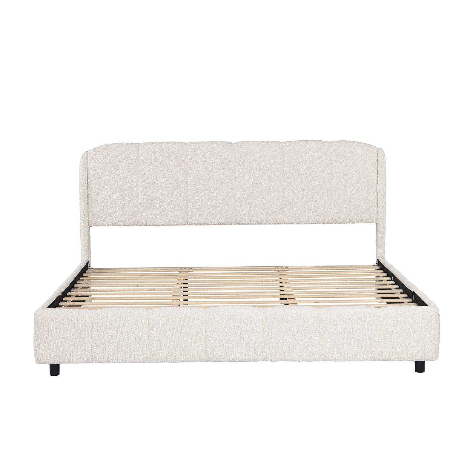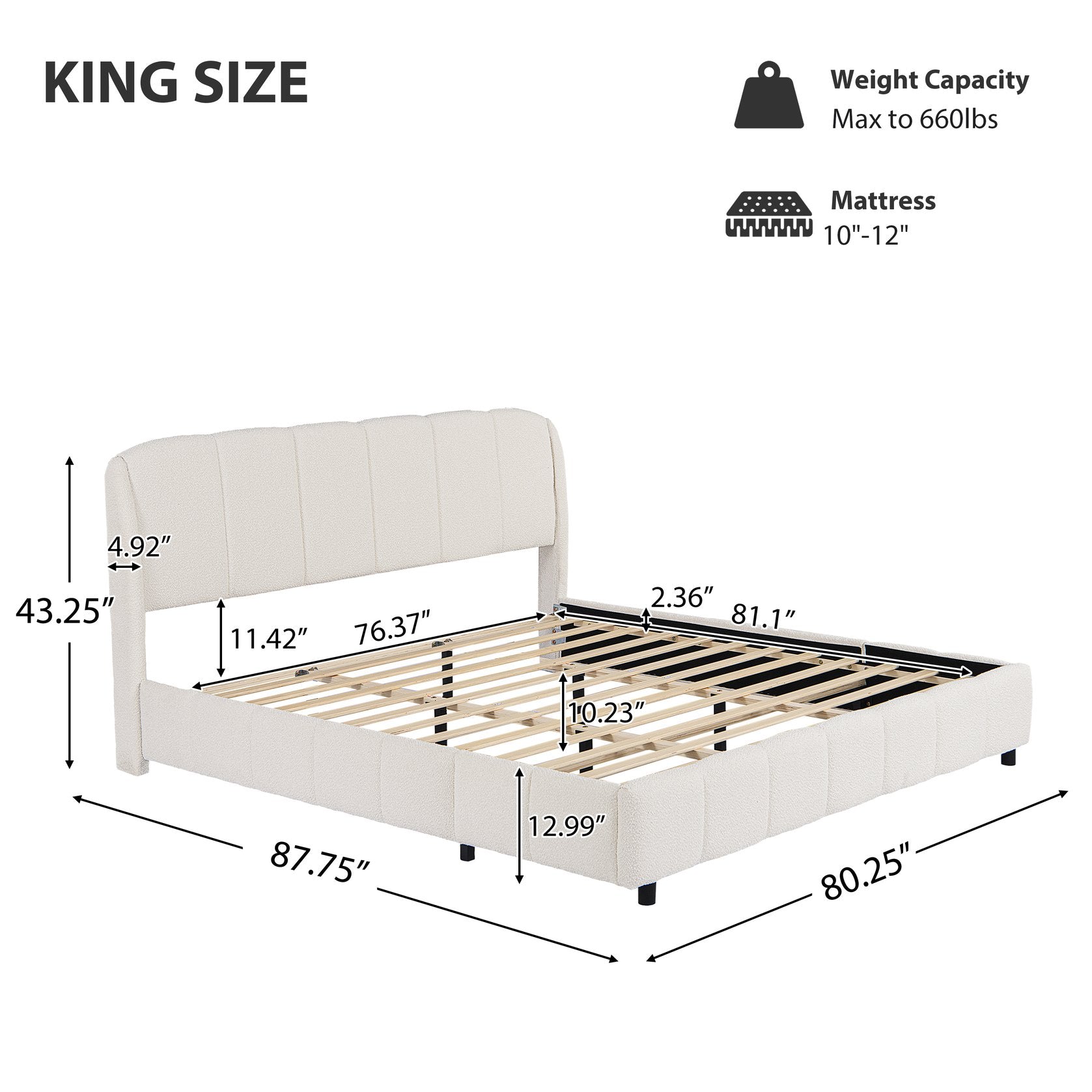 Transform your bedroom into a serene, sophisticated retreat with this king-size platform bed upholstered in soft boucle fabric. The gently curved headboard and neutral beige tone create a warm, inviting focal point while the durable construction and low-profile platform provide reliable support and modern style. Ideal for contemporary and transitional interiors, this bed combines tactile luxury with practical design for everyday comfort.