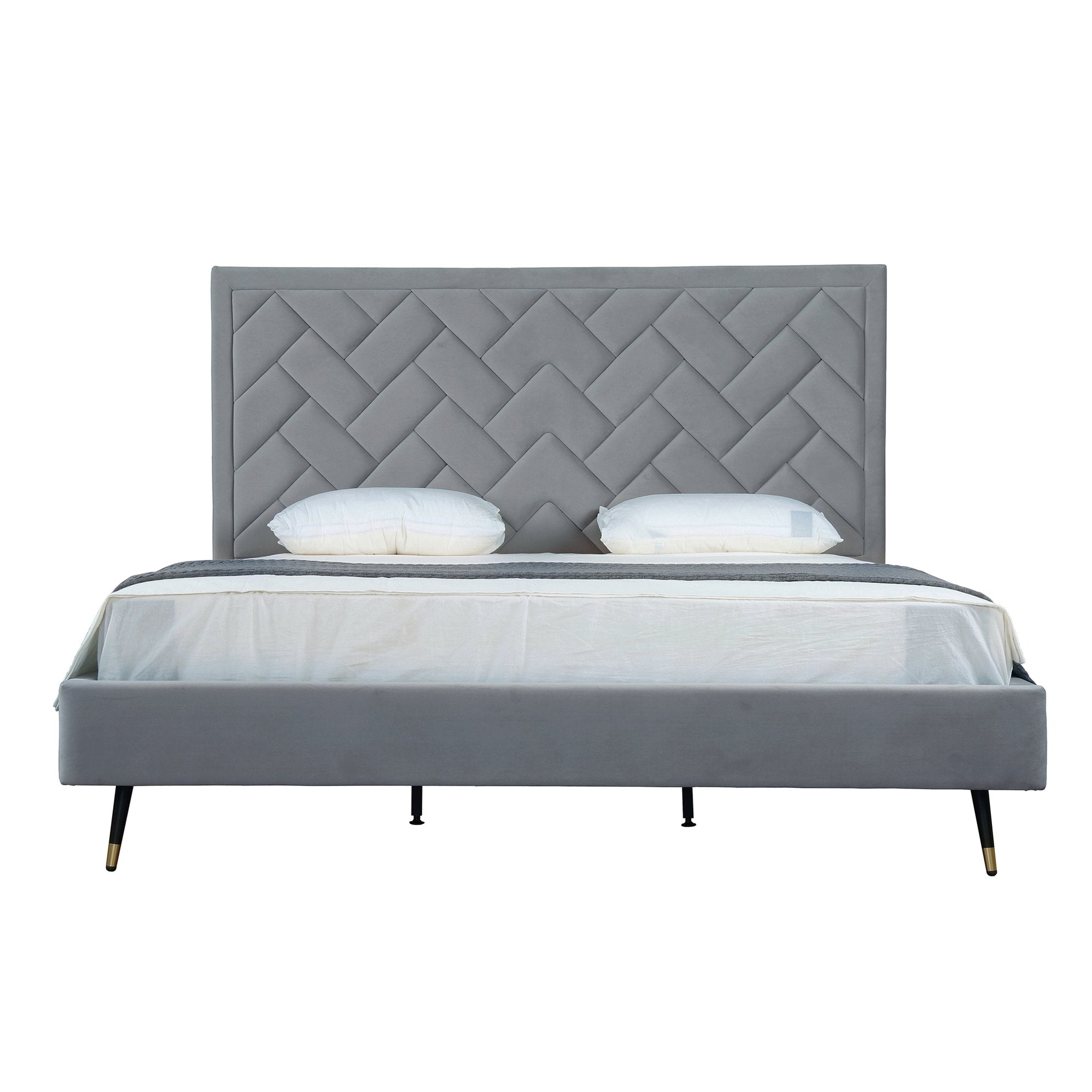 Bring understated luxury to your bedroom with the Crosby Upholstered Velvet King Bed in gray. Plush velvet upholstery, high-density foam padding, and a stitched chevron headboard create a refined focal point, while a sturdy slat system and metal legs provide reliable support—no box spring required. Designed for comfort, durability, and easy home assembly, this bed combines elegant style with practical features for everyday living.