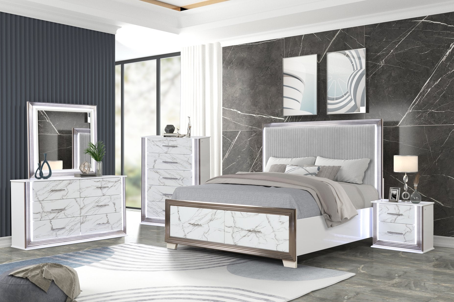 Experience modern luxury with a striking centerpiece that blends plush comfort, ambient lighting, and practical storage. This king bed elevates bedroom style with its upholstered, LED-lit headboard, marble-patterned footboard panels accented in metallic trim, and deep drawers for everyday organization—crafted for both form and function.