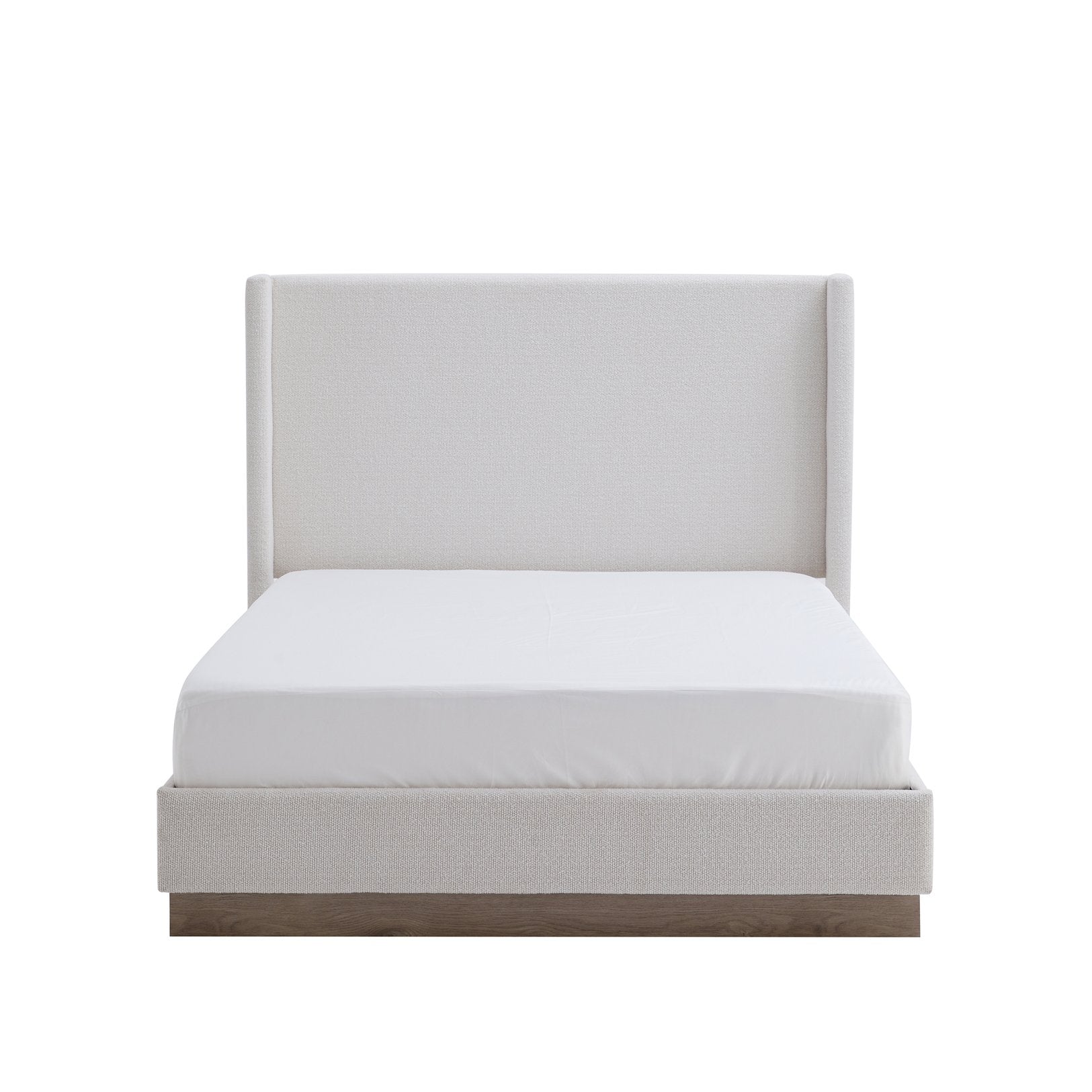 Refined rustic comfort meets minimalist design in this Hosford upholstered wingback platform bed. Crafted to anchor your bedroom with a quietly sophisticated presence, it pairs textured boucle upholstery with a sturdy wood-and-metal frame for lasting comfort and silent support — all without the need for a box spring. The high wingback headboard invites you to sit up and relax, while the neutral cream-white boucle complements modern and rustic interiors alike.