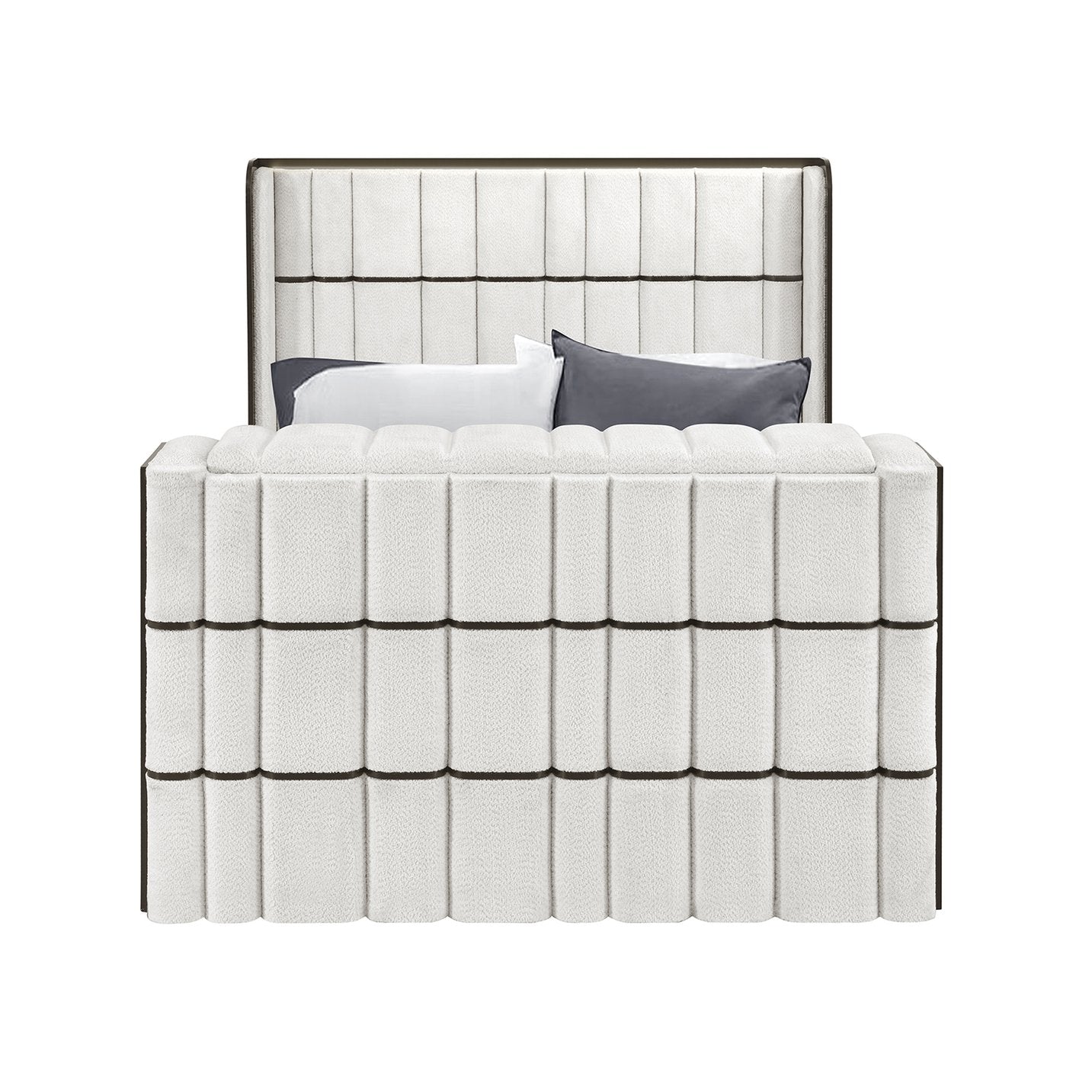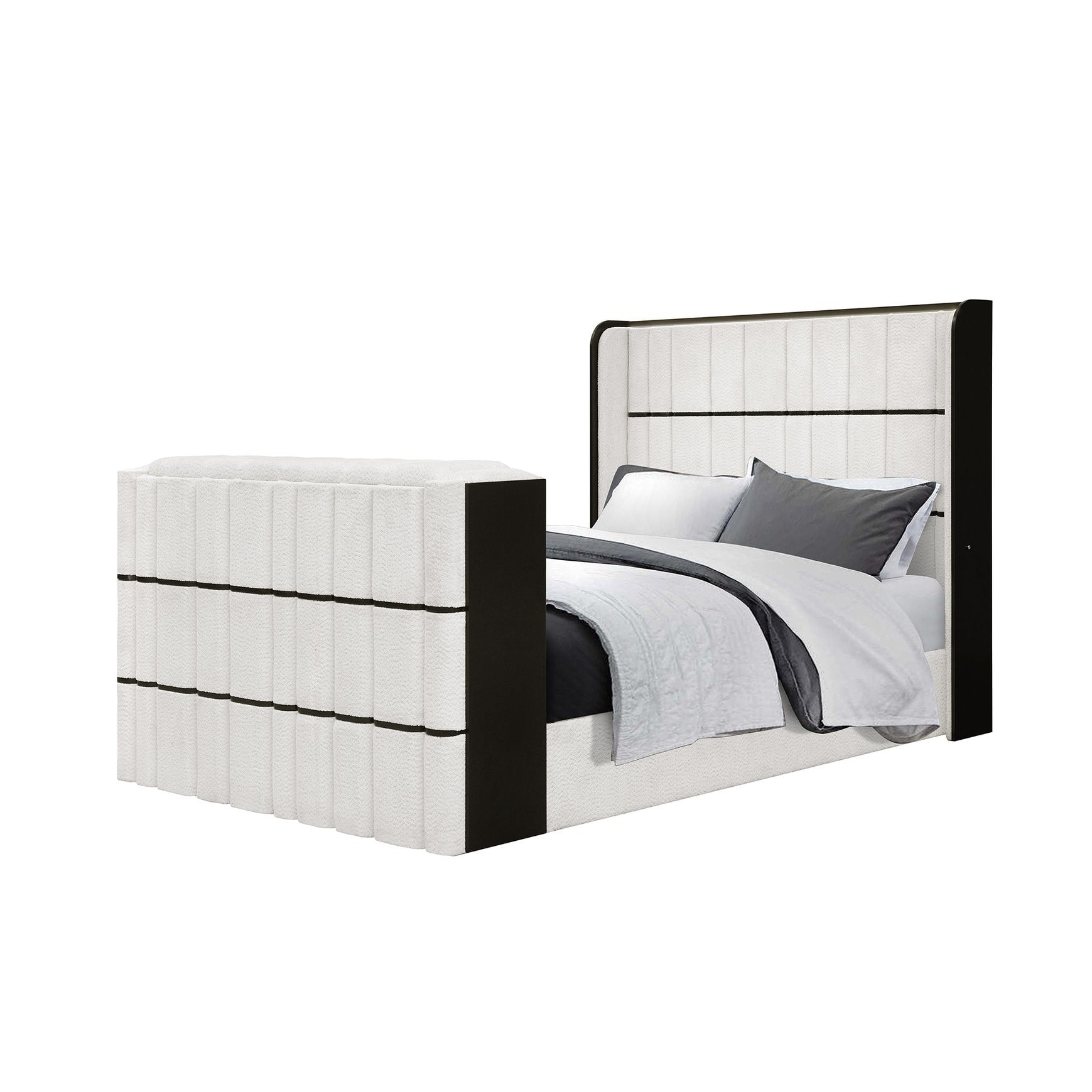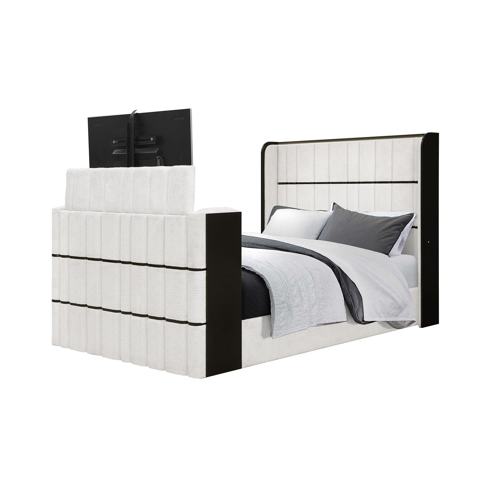 Transform your bedroom into a luxurious entertainment retreat with this striking white and black king bed that combines solid construction with advanced multimedia features. Designed for comfort and convenience, it offers an ultra-soft upholstered headboard, built-in speakers, LED accent lighting, an integrated electric fireplace, and a hidden lift that raises a 50" TV from the footboard — all while maintaining a sleek, modern profile.