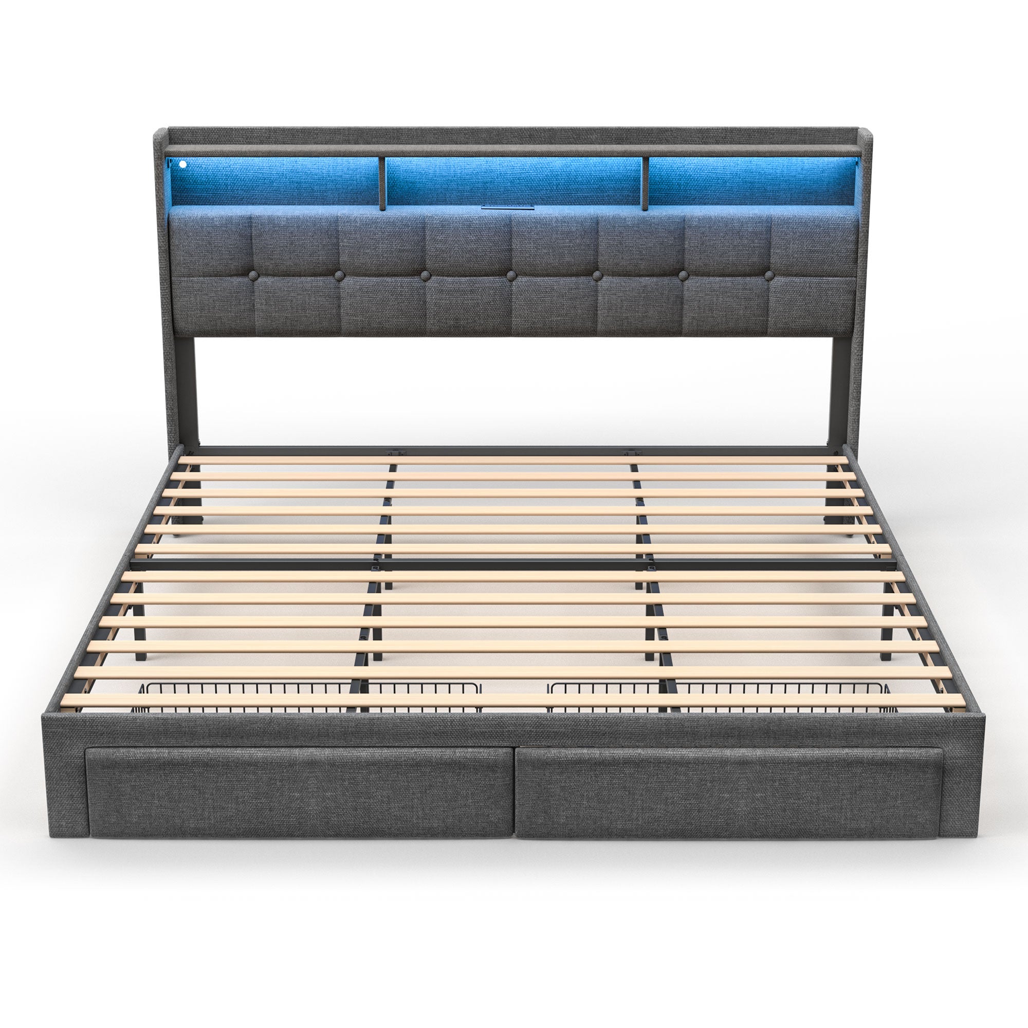 Transform your bedroom into a modern, functional retreat with this upholstered platform bed—designed for comfort, convenience, and contemporary style. Featuring integrated LED lighting, a built-in charging station, ample storage, and a supportive slatted system, this king-size bed eliminates the need for a box spring while keeping nighttime essentials within reach.