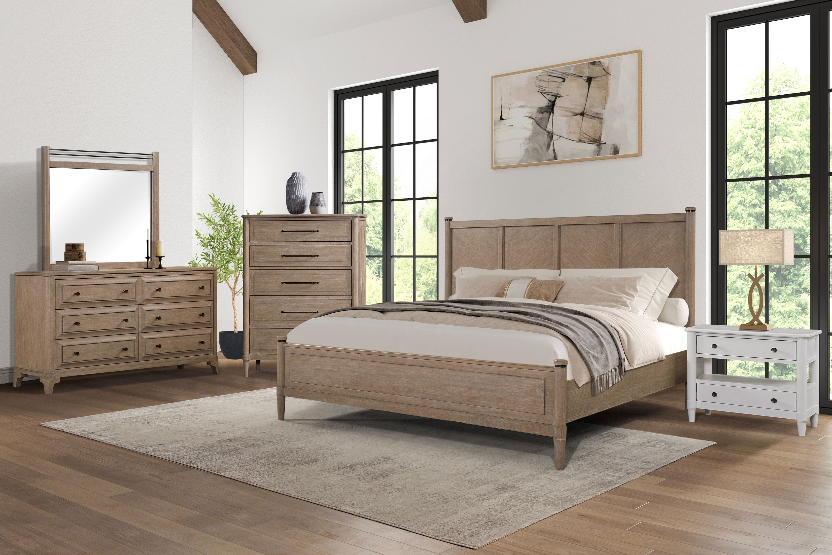 - Design accents: Herringbone-pattern headboard for subtle visual interest