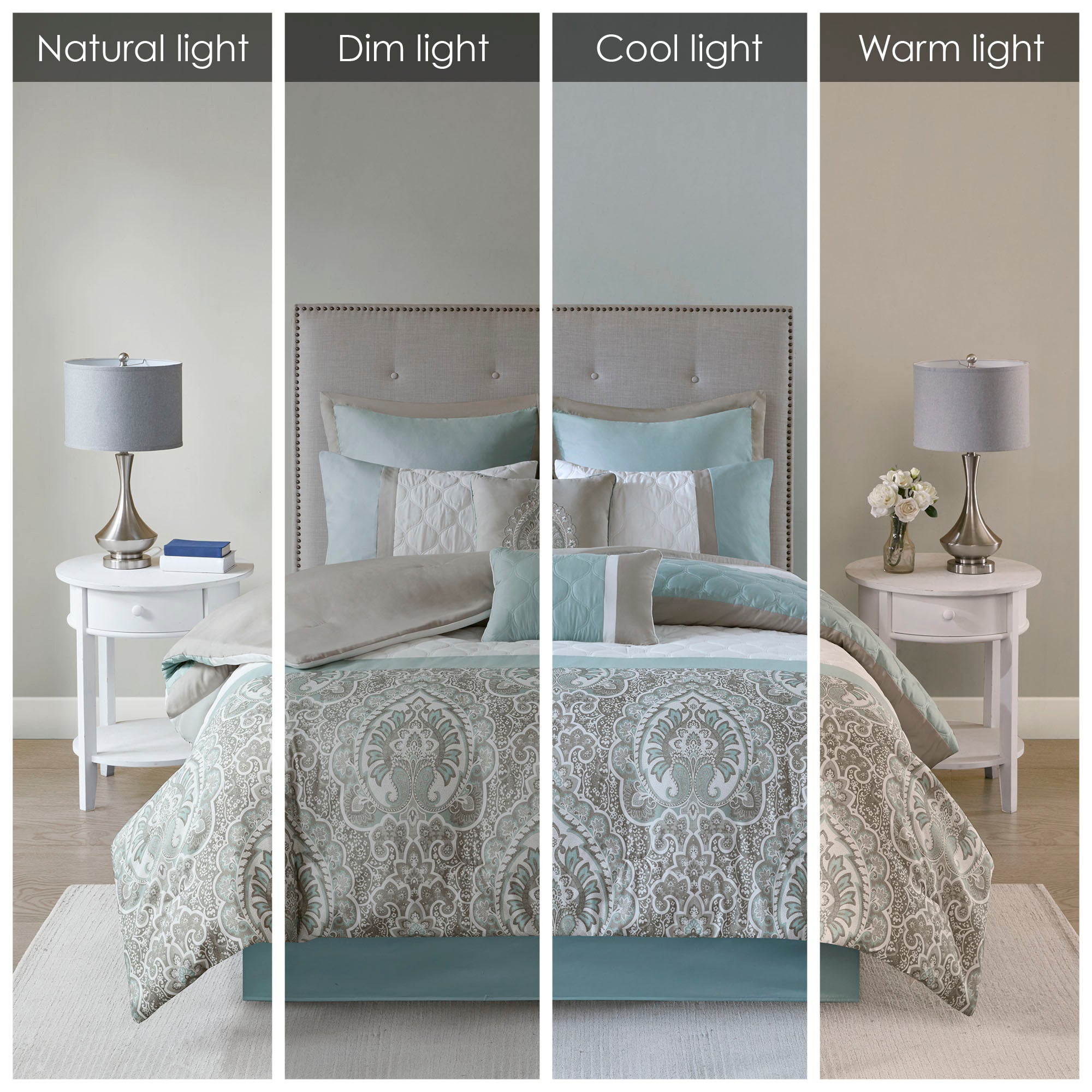 Refresh your bedroom with the refined elegance of the Shawnee 8-piece comforter set. Designed with a pieced diamond-quilted microfiber comforter and a partial damask print in seafoam and brown, this coordinated ensemble balances classic style with modern comfort. The set includes matching shams, Euro shams with contrasting brown flanges, two embroidered decorative pillows, and a solid seafoam bed skirt for a complete, polished look. Hypoallergenic, dust-resistant polyester fill provides cozy loft while remaining easy-care and machine washable.