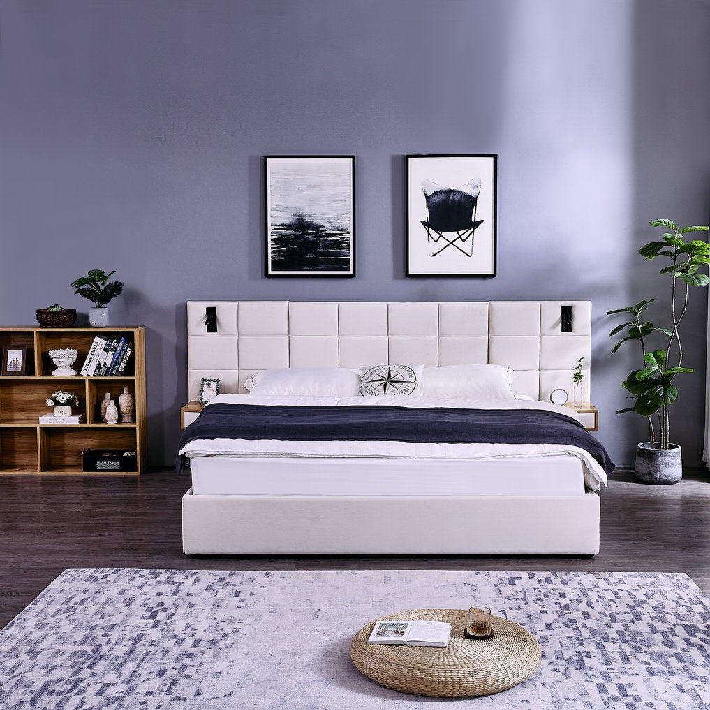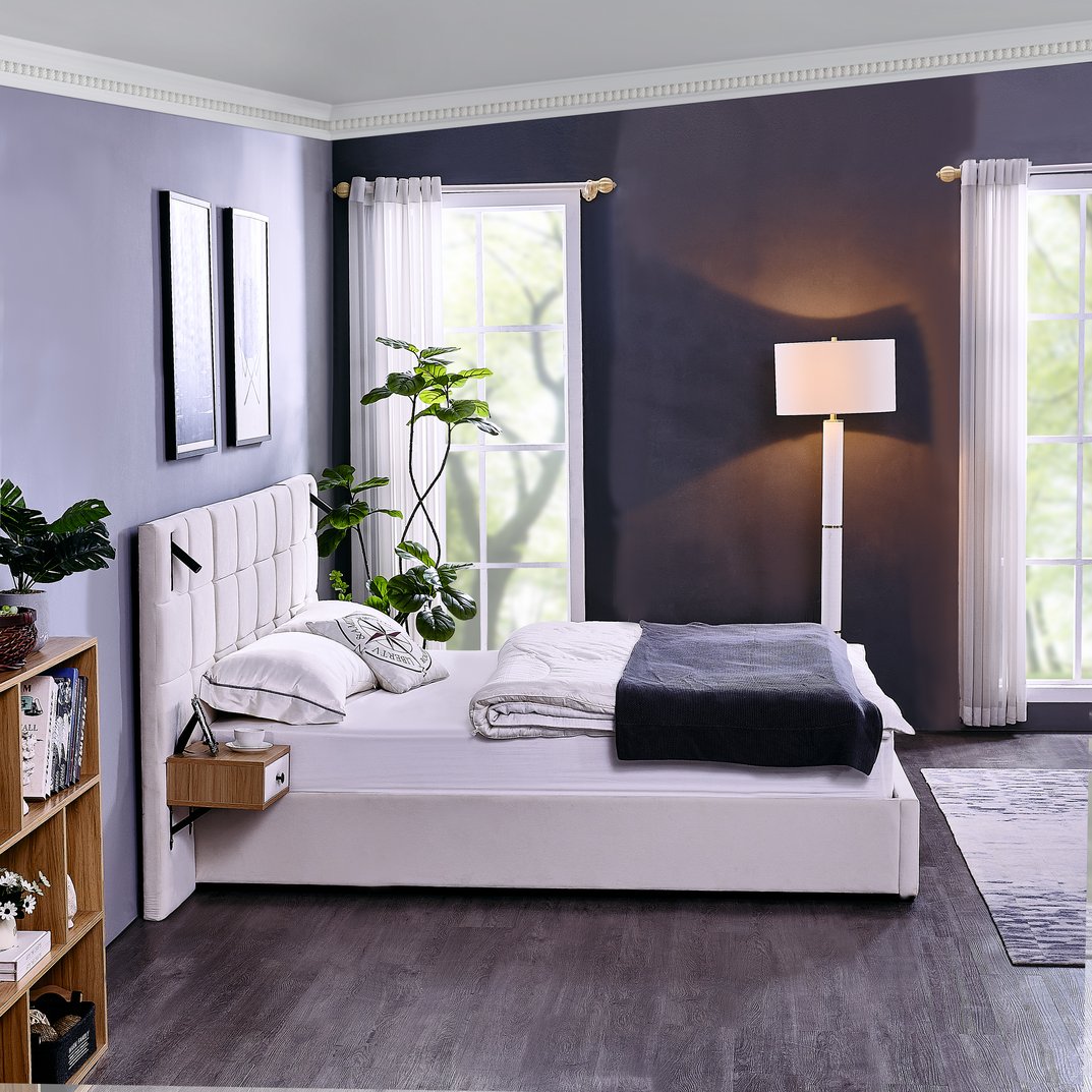 Give your bedroom an elegant, practical upgrade with this king-size velvet upholstered platform bed. Soft beige velvet, a plush foam-padded headboard, and integrated storage make it an ideal centerpiece for modern and transitional interiors. Designed for comfort and convenience, the bed includes hydraulic lift storage, built-in reading lamps, USB charging, and two open shelves for bedside essentials—combining style with everyday functionality.