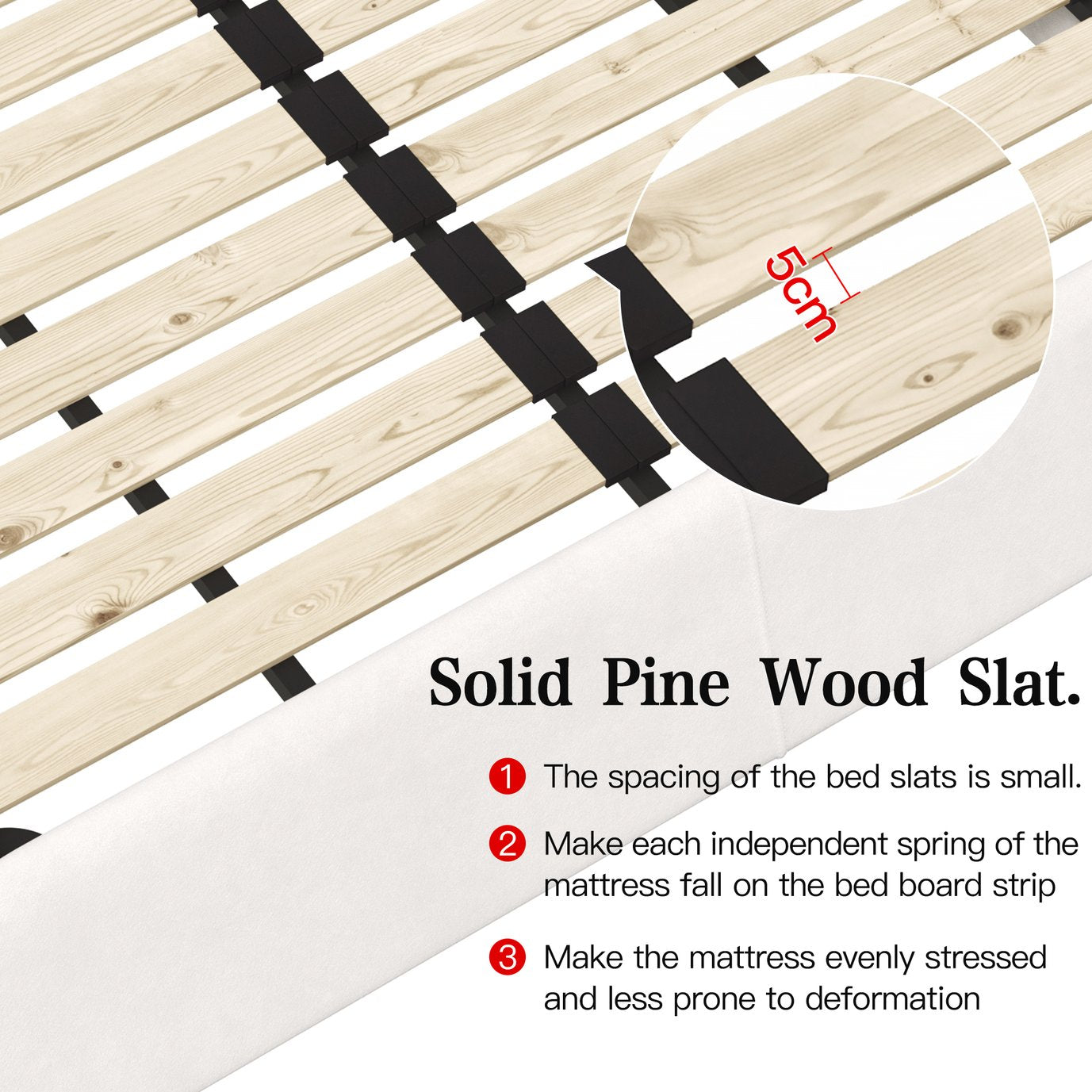- [Solid & Sturdy]: The frame and slats are made of solid pine wood, which is hard, firm, corrosion resistant, not easy to deform and crack, and has a long service life. The bed slat structure consists of iron frame and solid wood, 24 widened slats, with a width of about 10cm, providing dense and powerful support for the weight of up to 1000 pounds. The metal feet are scientifically designed to withstand pressure and provide sturdy and stable support without deformation.