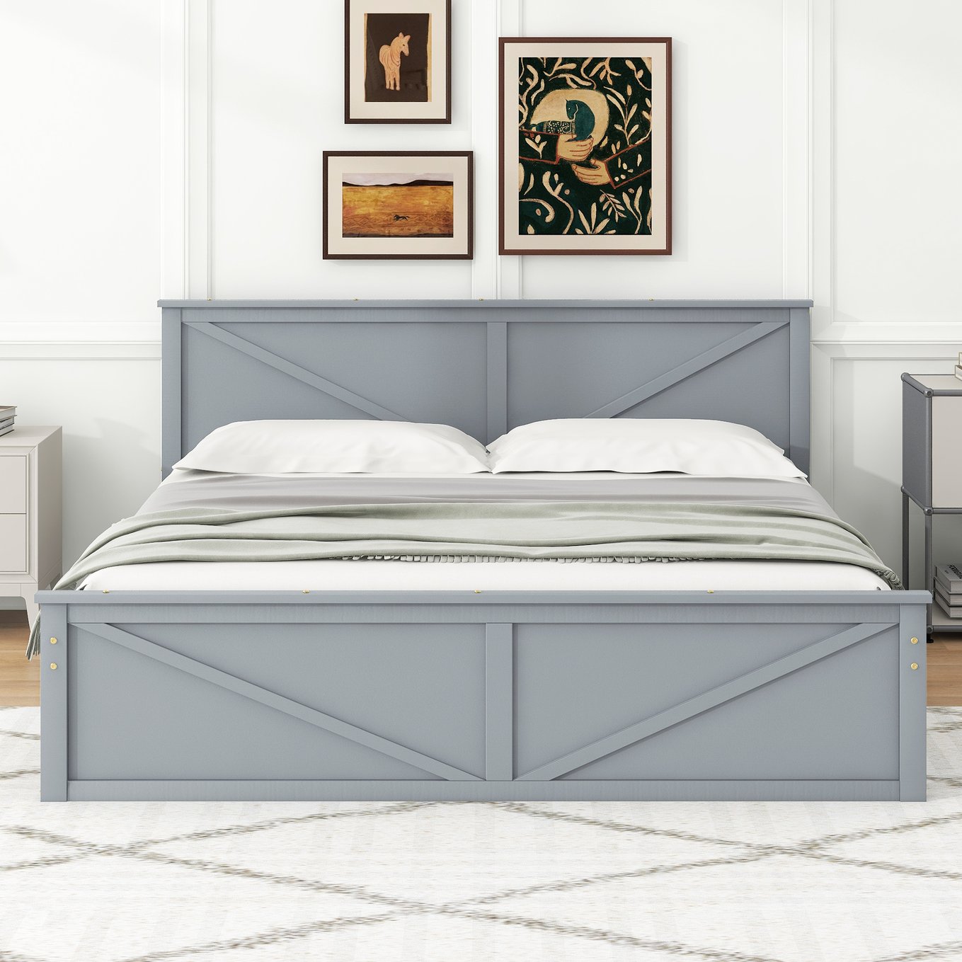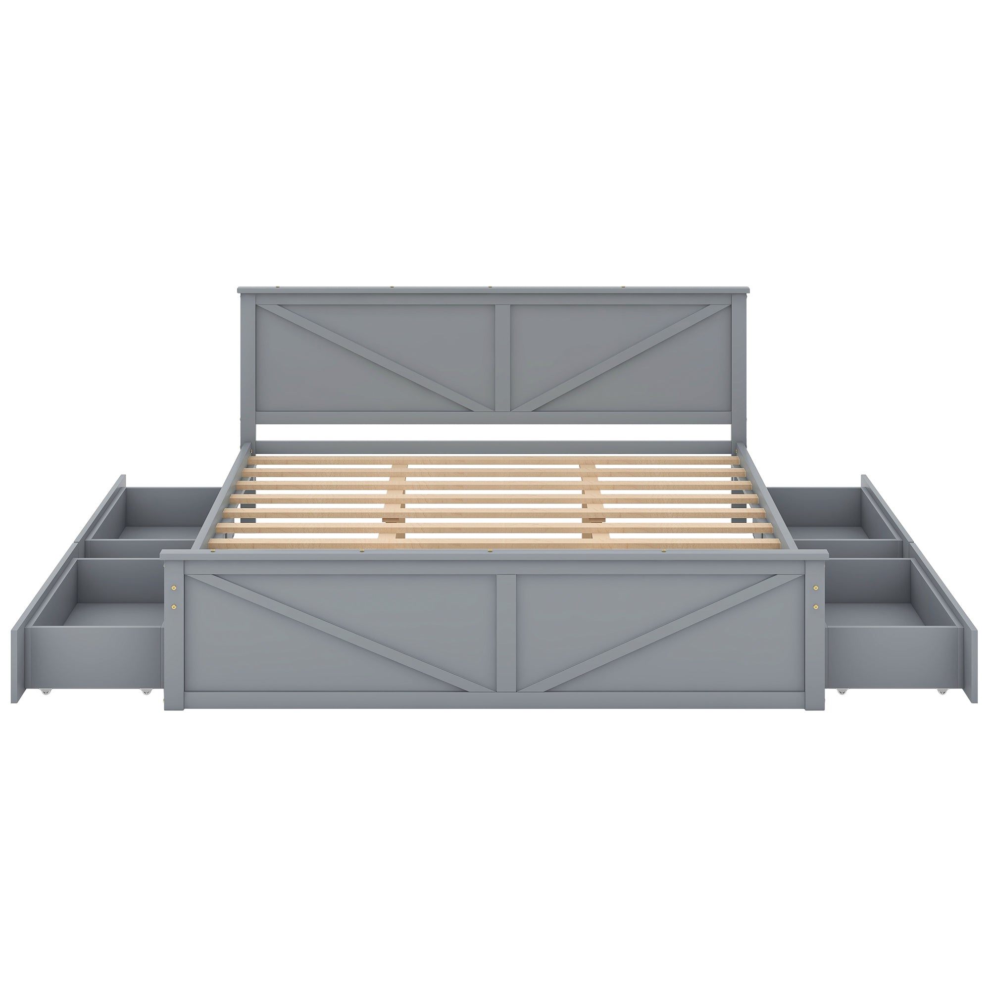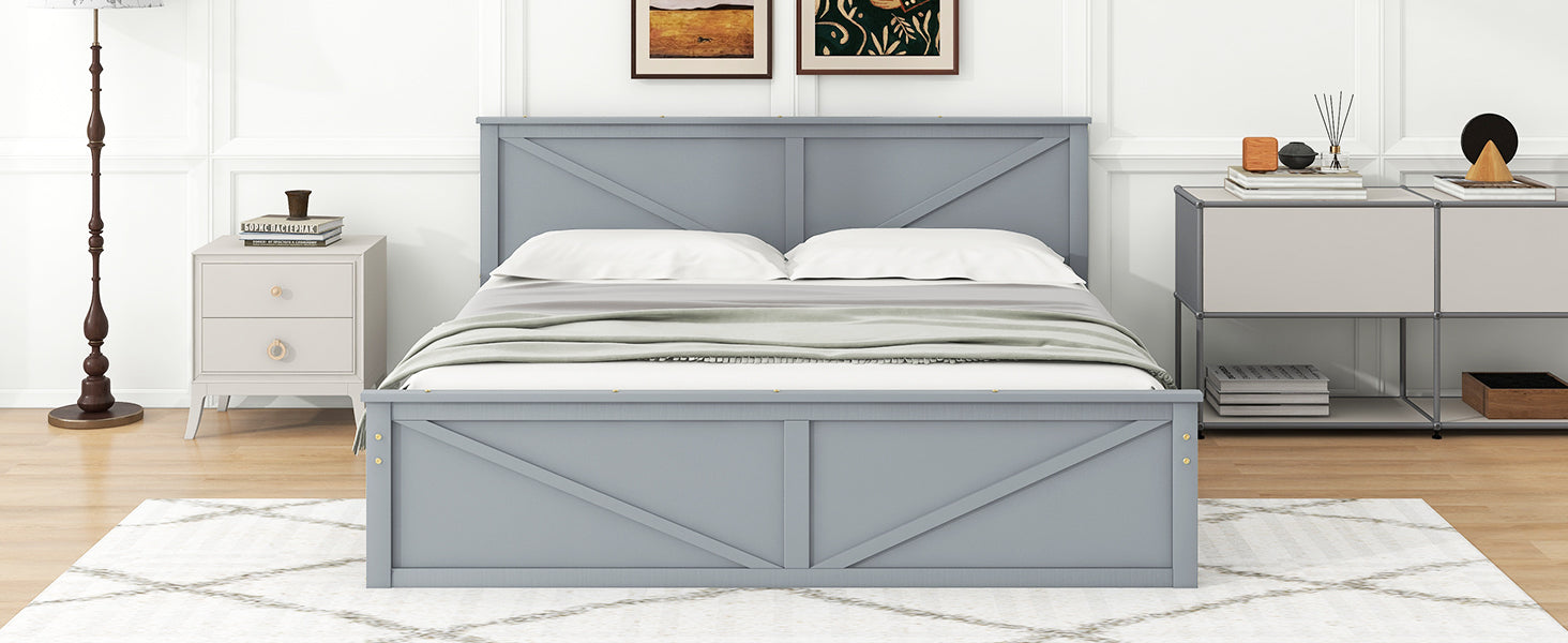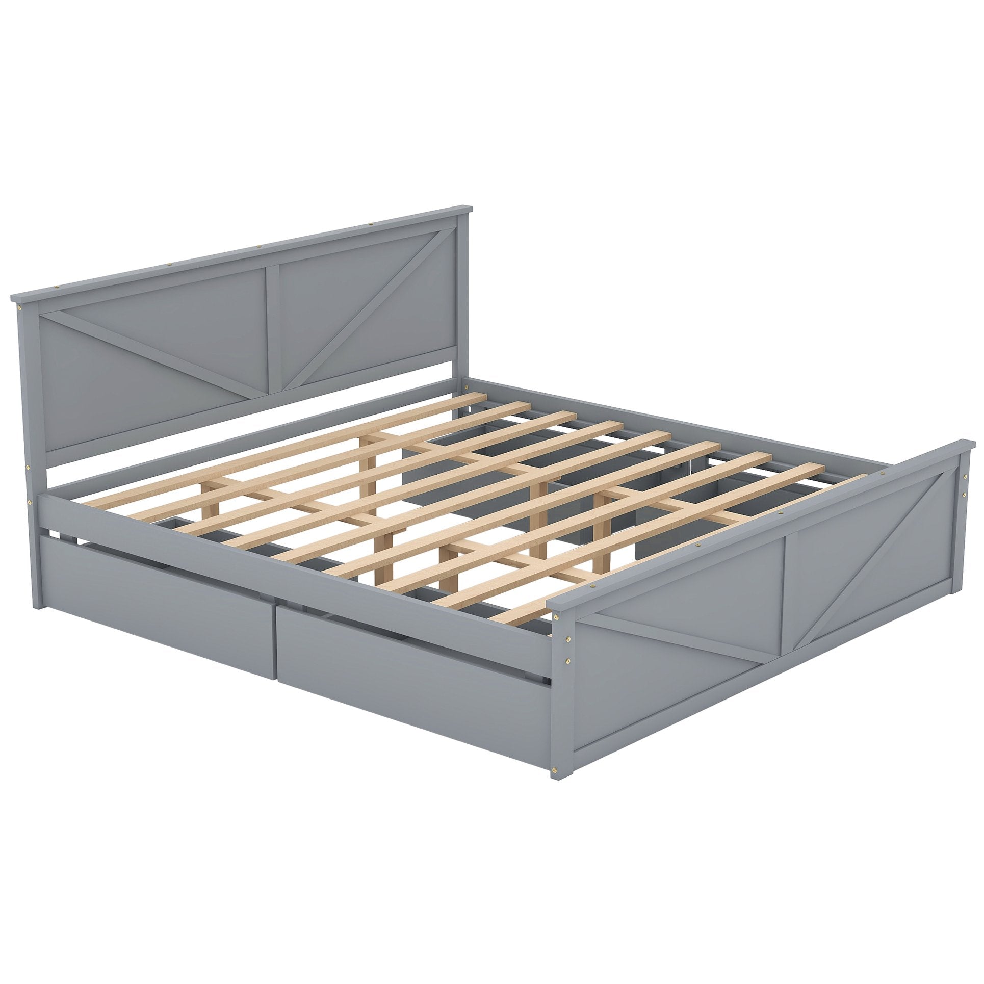 Upgrade your bedroom with this sturdy, space-saving king platform bed that blends solid construction and smart storage. Designed to support a standard king mattress without a box spring, it features a durable pine and MDF frame, tightly spaced solid slats for reliable support, and four full-length underbed drawers to keep linens and clothes neatly tucked away. The neutral gray finish complements a variety of decor styles while the elevated profile and support legs ensure ventilation and stability for long-lasting comfort.