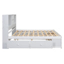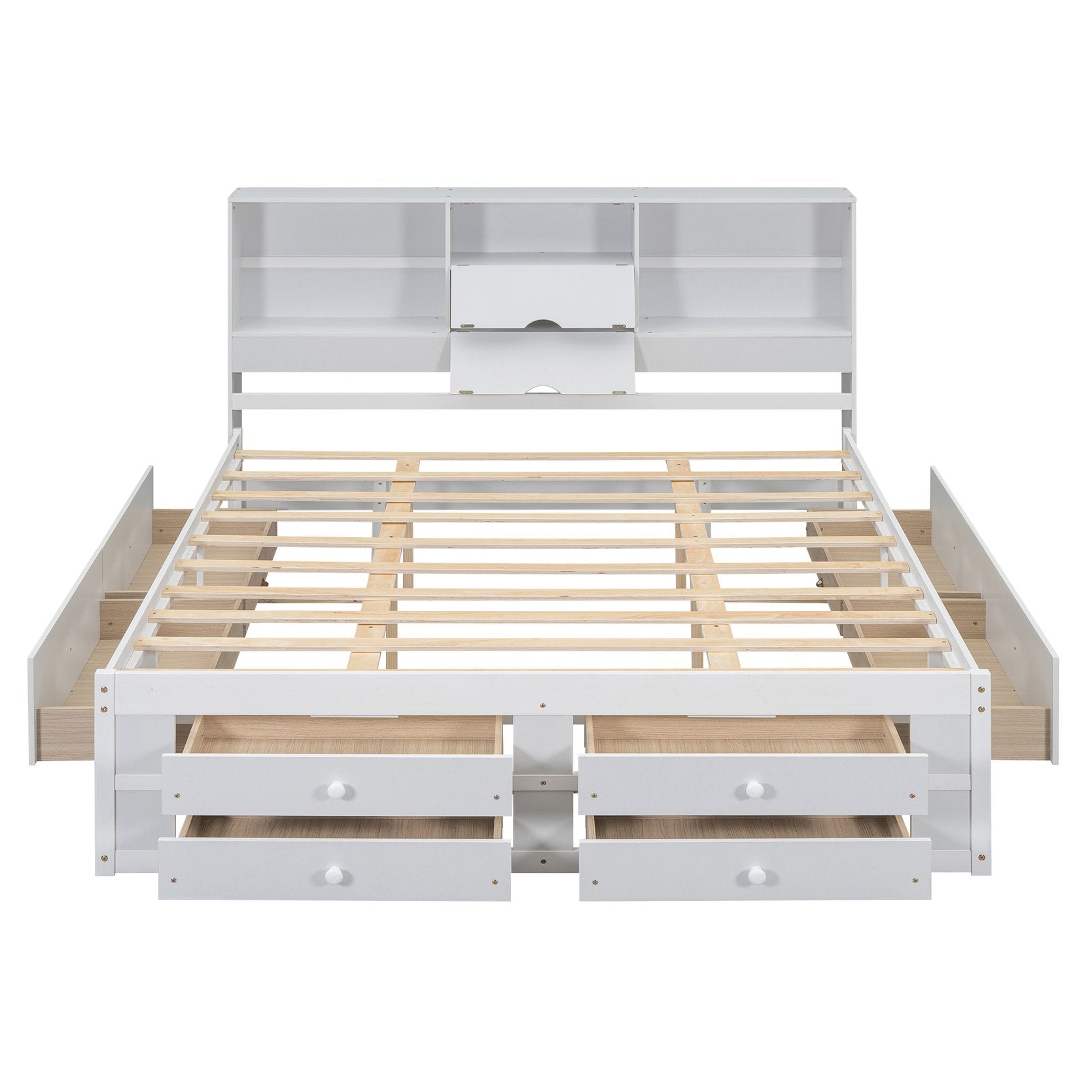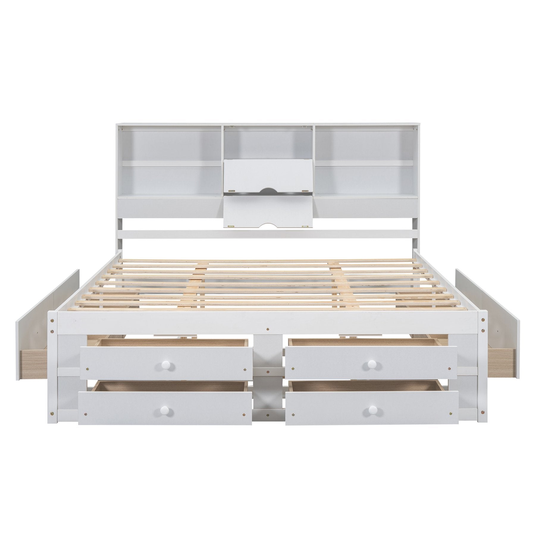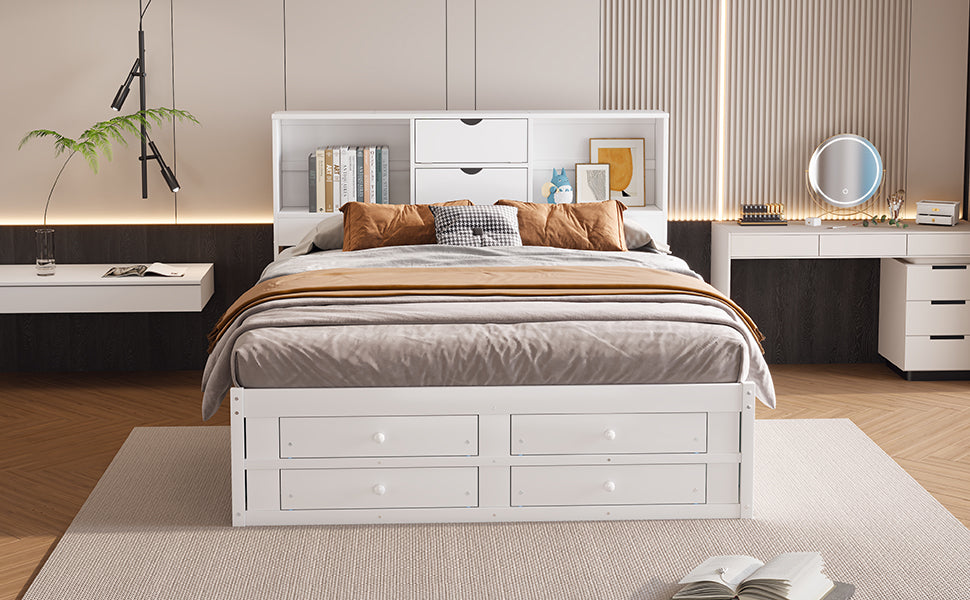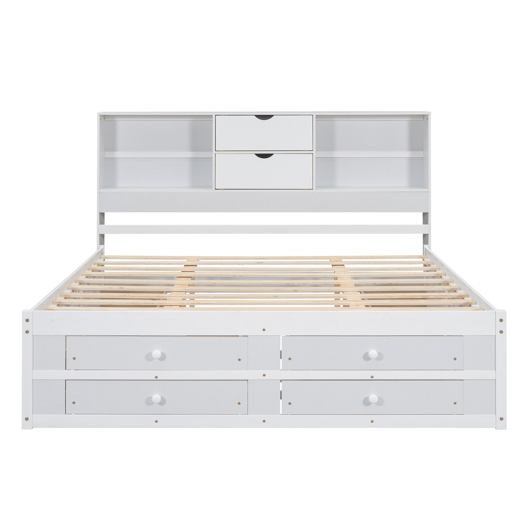 This king-size platform bed blends clean contemporary design with highly functional storage, making it ideal for bedrooms where space and style are both priorities. Built from solid pine wood and MDF with a crisp white finish, it features a storage headboard and eight drawers to keep linens, clothes, and bedside essentials neatly organized. Its sturdy slat system supports a mattress without the need for a box spring and is designed for long-term use.