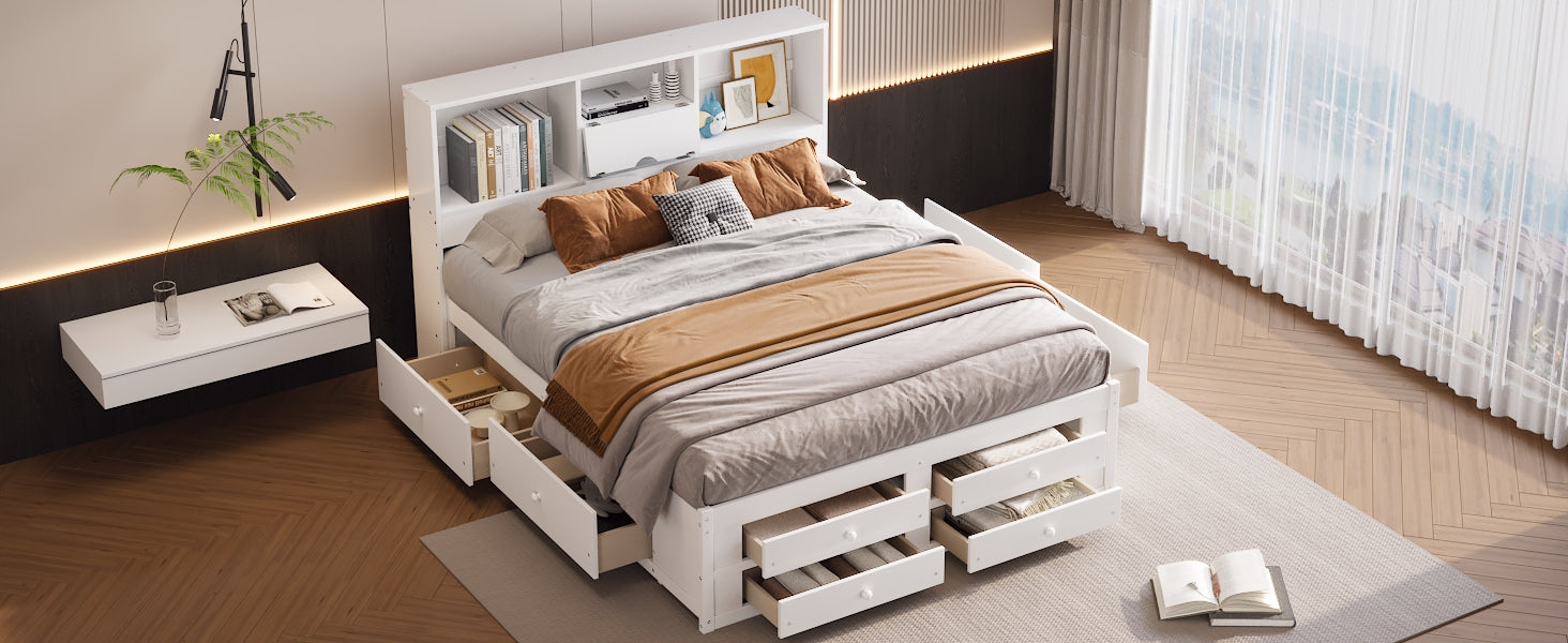- Drawers: Eight built-in drawers provide ample under-bed storage for clothing, bedding, and accessories—optimizes bedroom space and reduces clutter.