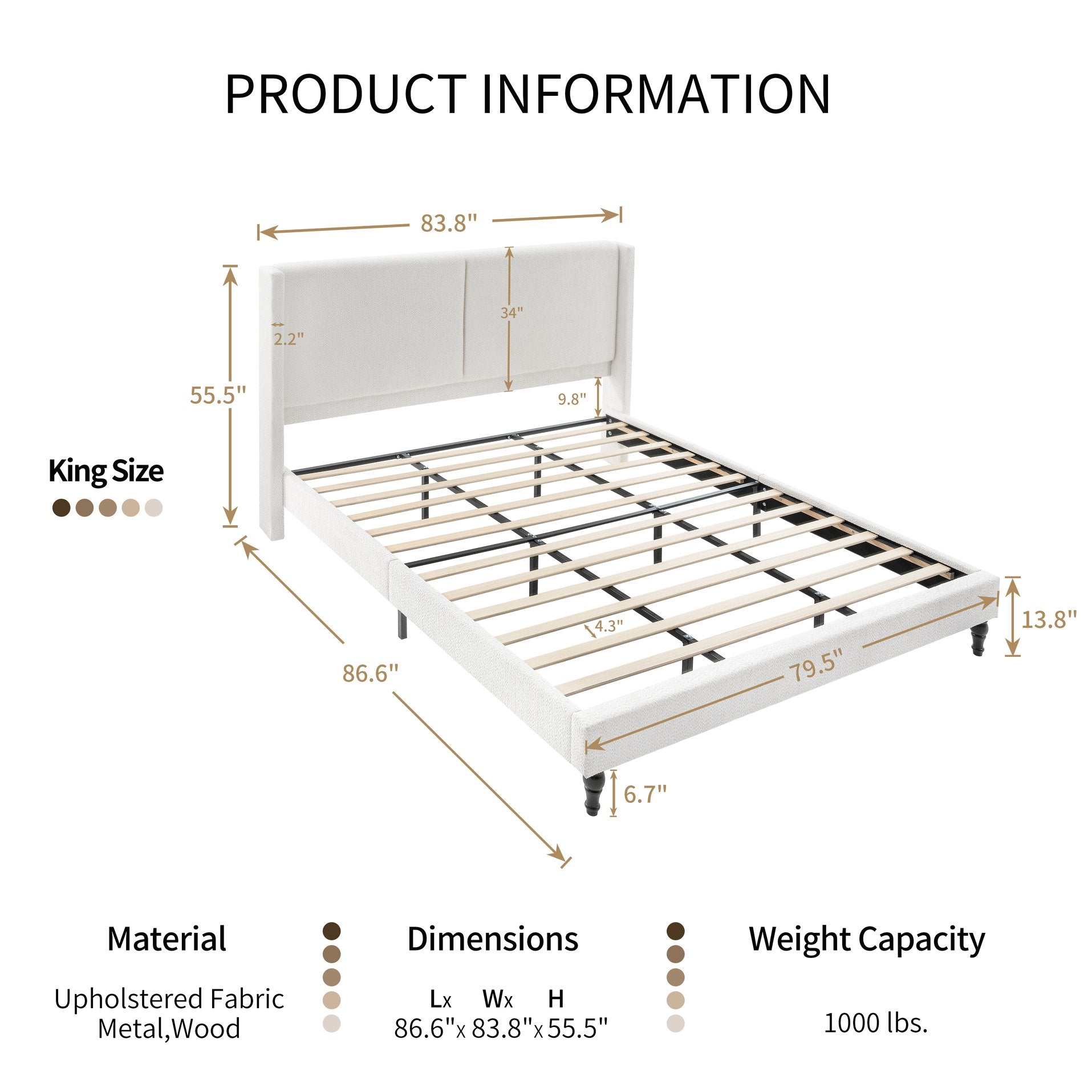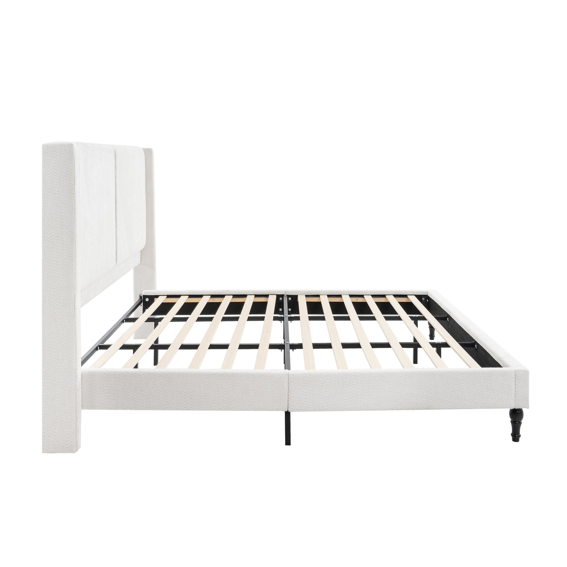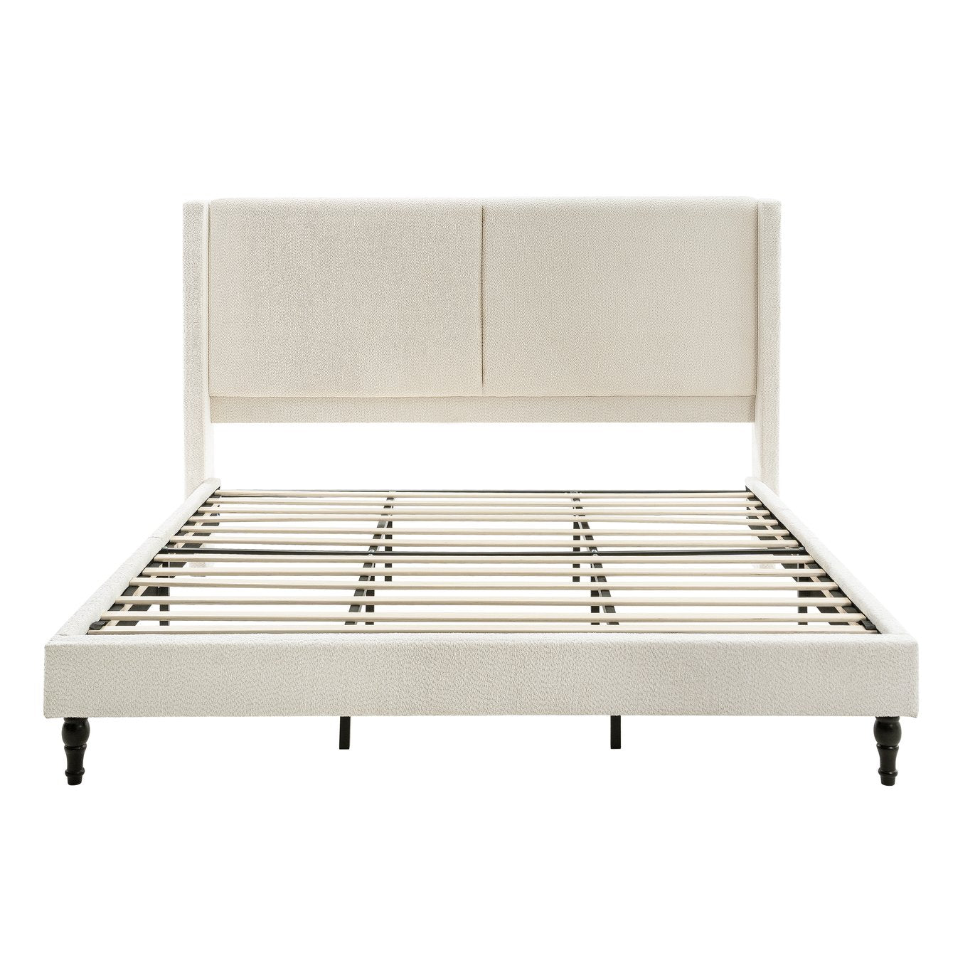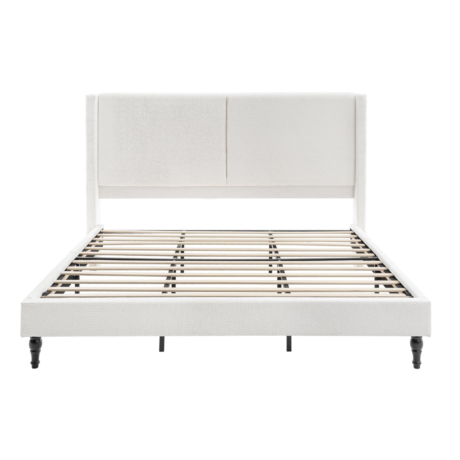 Upgrade your bedroom with a modern, sturdy king-size bed frame that blends elegant boucle upholstery with solid construction for lasting comfort and support. Designed to eliminate the need for a box spring, this bed frame features a high, plush headboard and reinforced slat system for mattress stability, making it a stylish and practical centerpiece for contemporary interiors.
