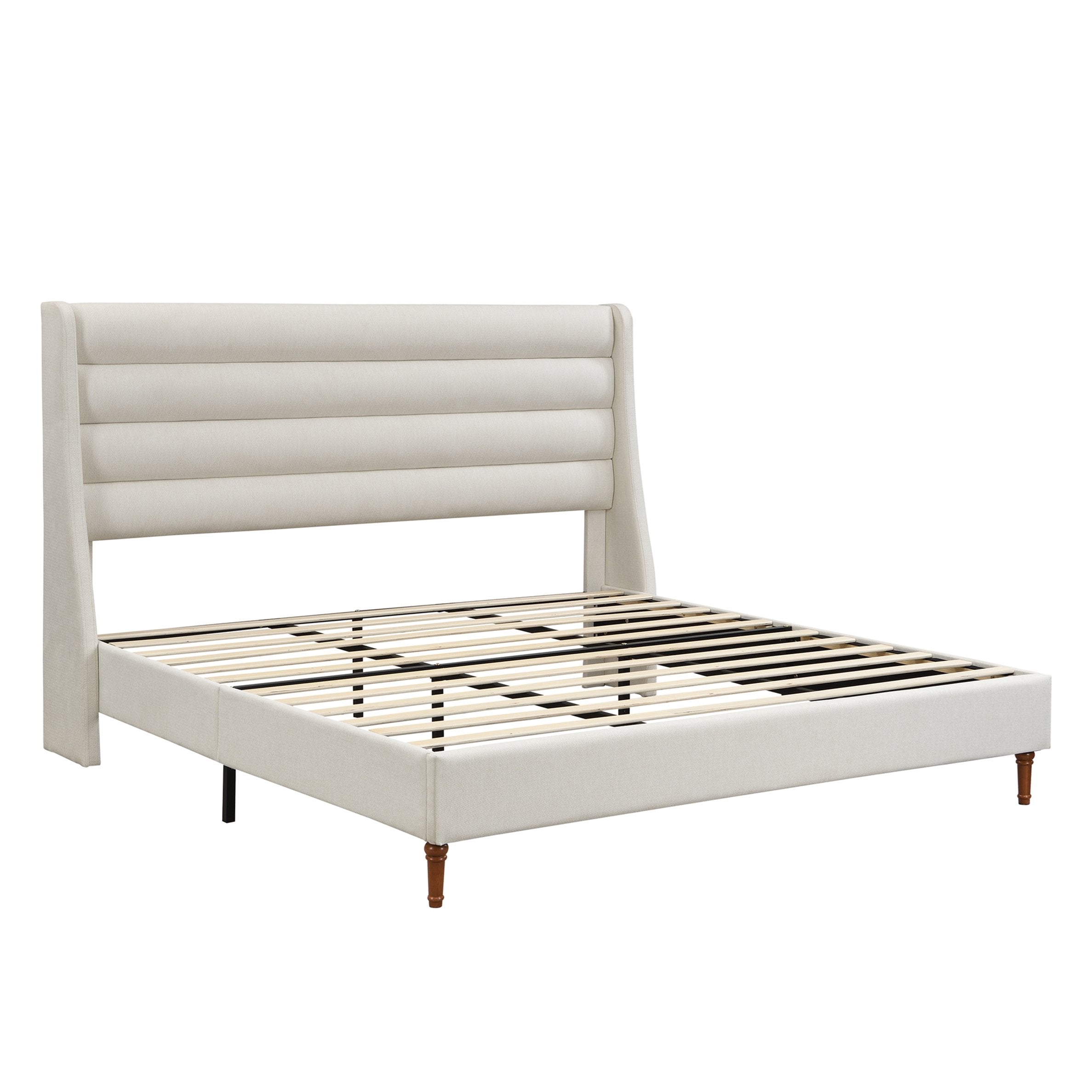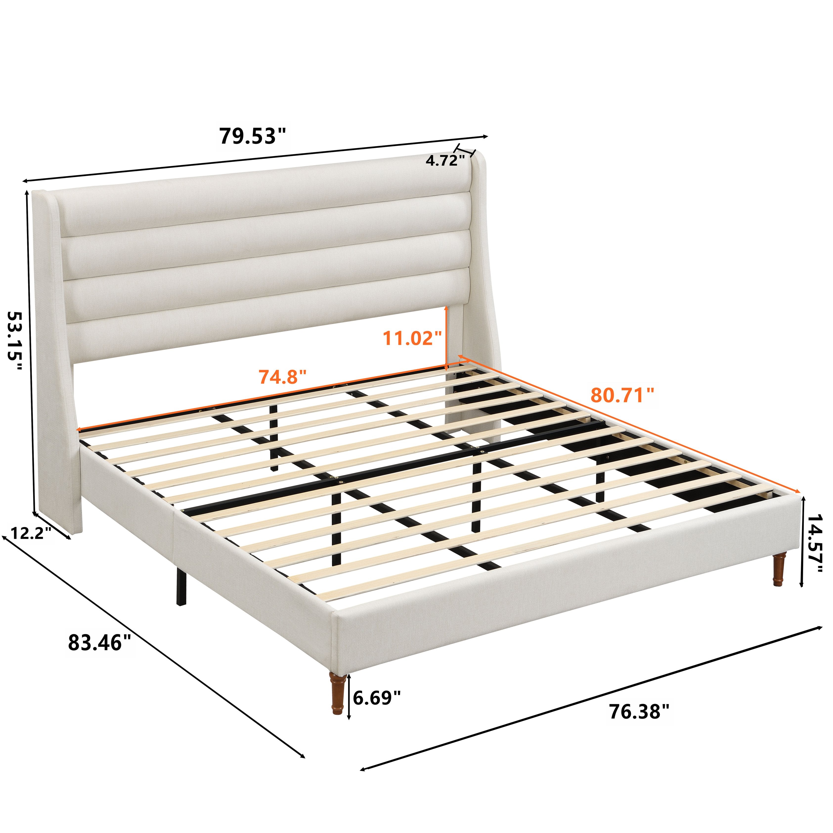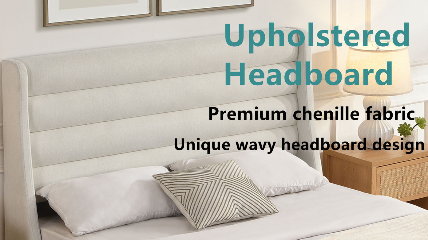 Transform your bedroom into a serene, modern retreat with this king-size upholstered platform bed. Designed for both comfort and style, it features a sculpted wave-shaped high headboard wrapped in premium ivory chenille fabric, solid wood construction for long-lasting support, and a noise-reducing design that keeps nights peaceful. This bed requires no box spring and assembles quickly with velcro-guided fittings and clear instructions, making it a practical centerpiece for contemporary bedrooms.