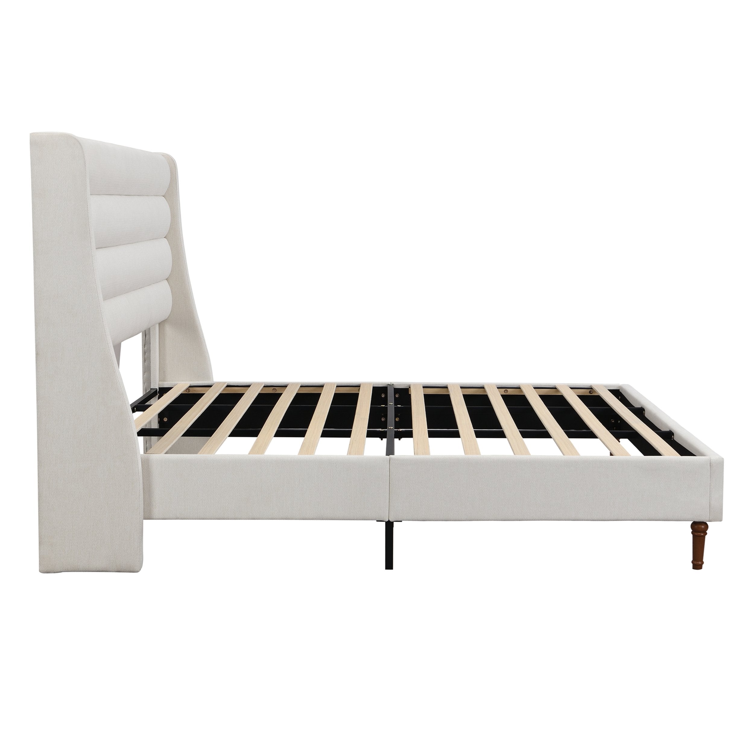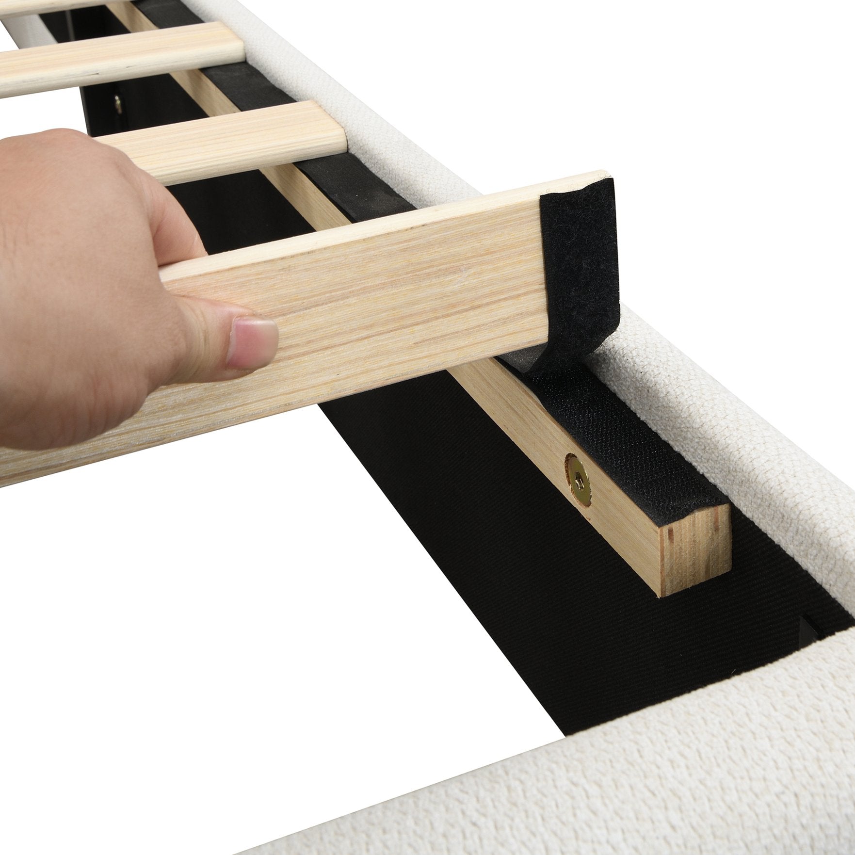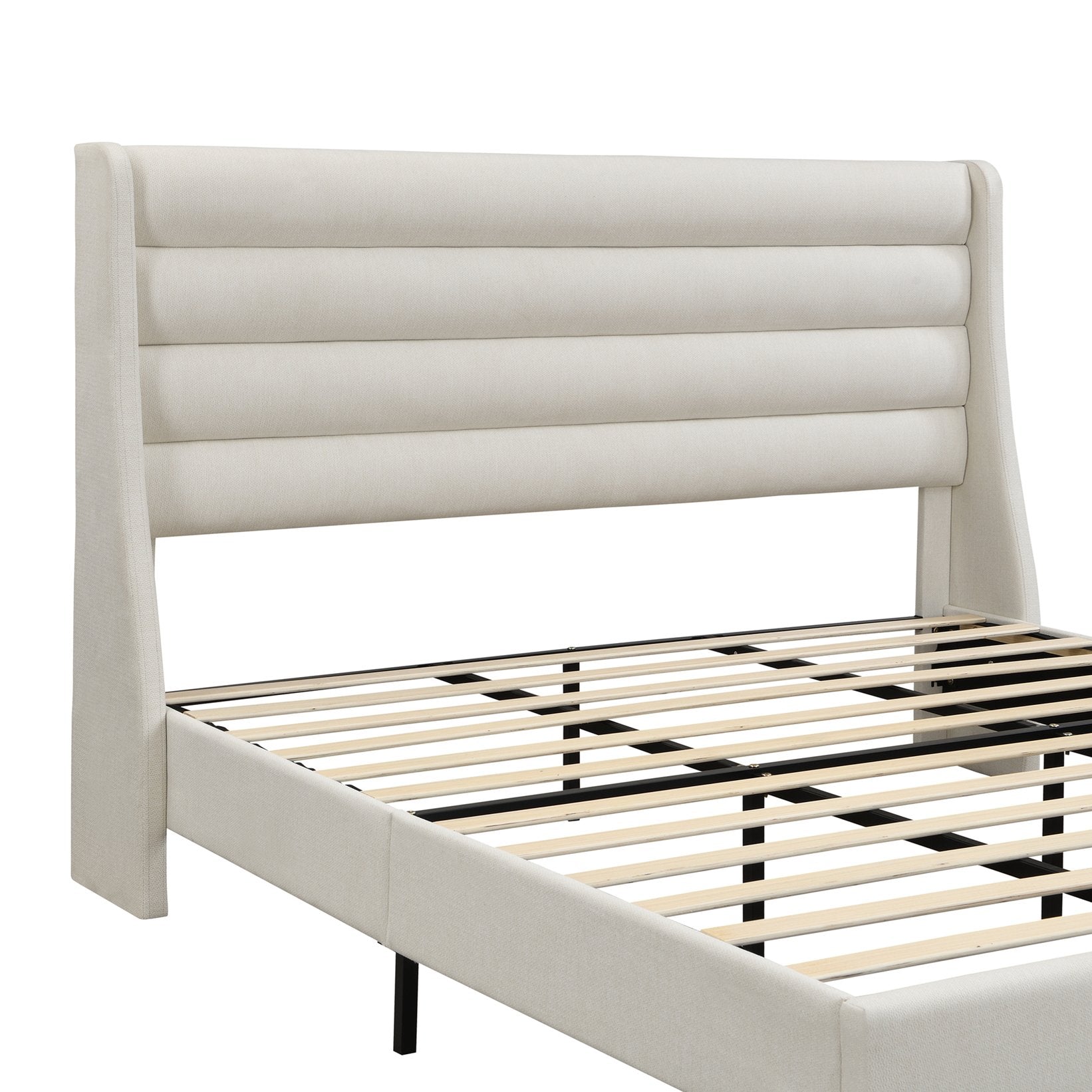 Transform your bedroom into a serene, modern retreat with this king-size upholstered platform bed. Designed for both comfort and style, it features a sculpted wave-shaped high headboard wrapped in premium ivory chenille fabric, solid wood construction for long-lasting support, and a noise-reducing design that keeps nights peaceful. This bed requires no box spring and assembles quickly with velcro-guided fittings and clear instructions, making it a practical centerpiece for contemporary bedrooms.