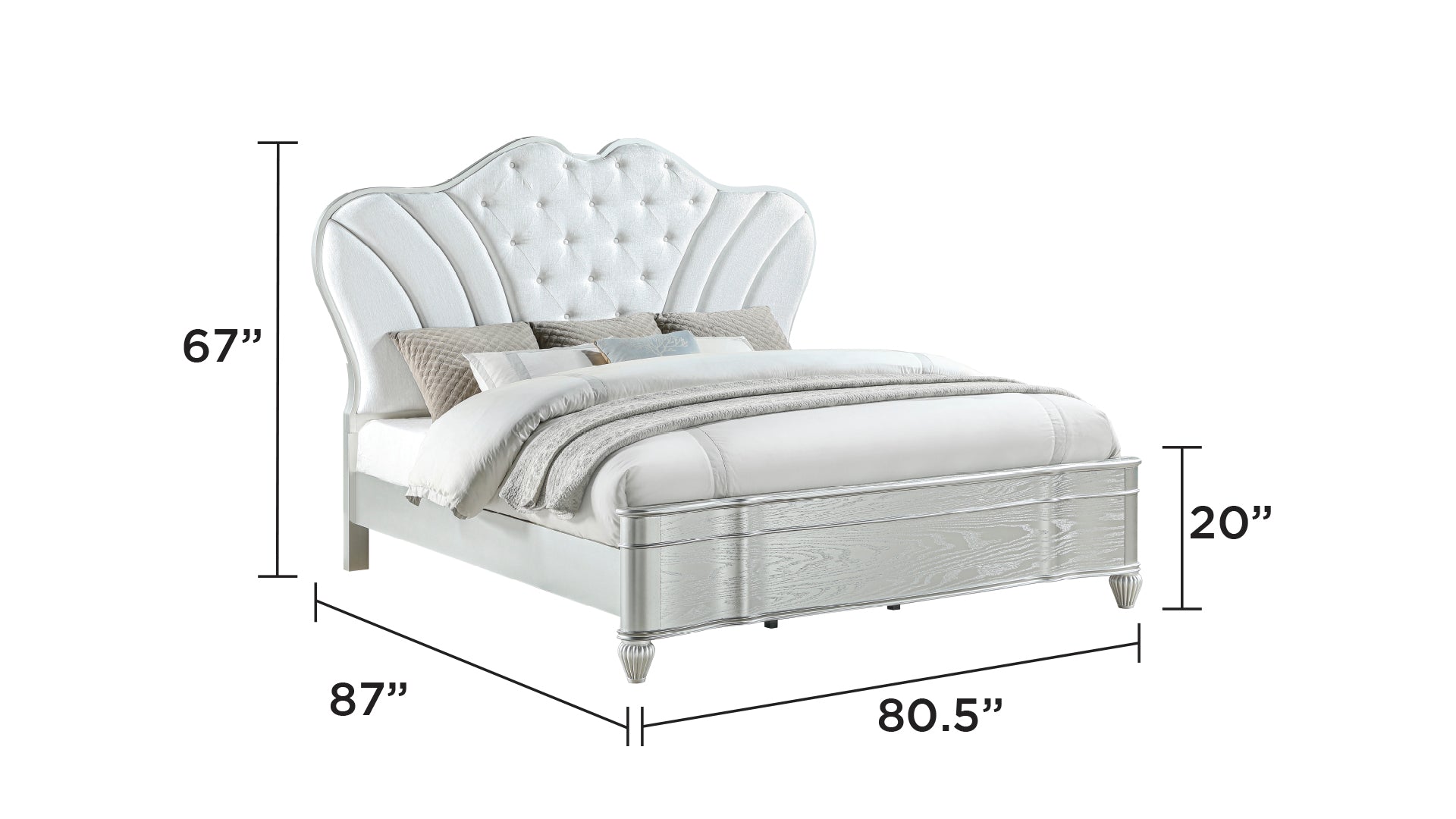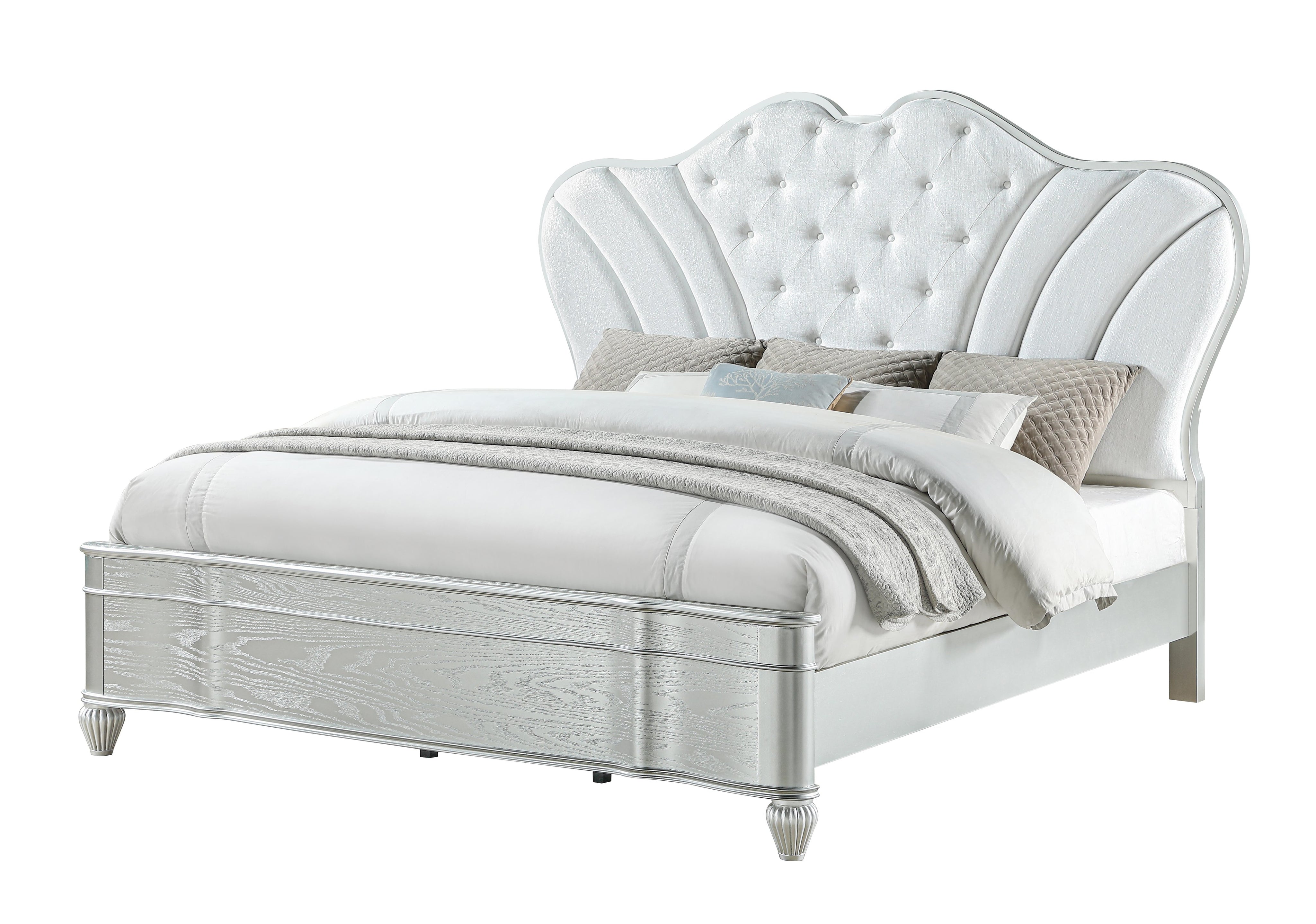 Elevate your bedroom with a timeless blend of classic elegance and modern comfort. This upholstered, button-tufted king bed features a luxurious curved headboard and a refined silver frame that together create a striking focal point while offering supportive comfort for reading or relaxing.