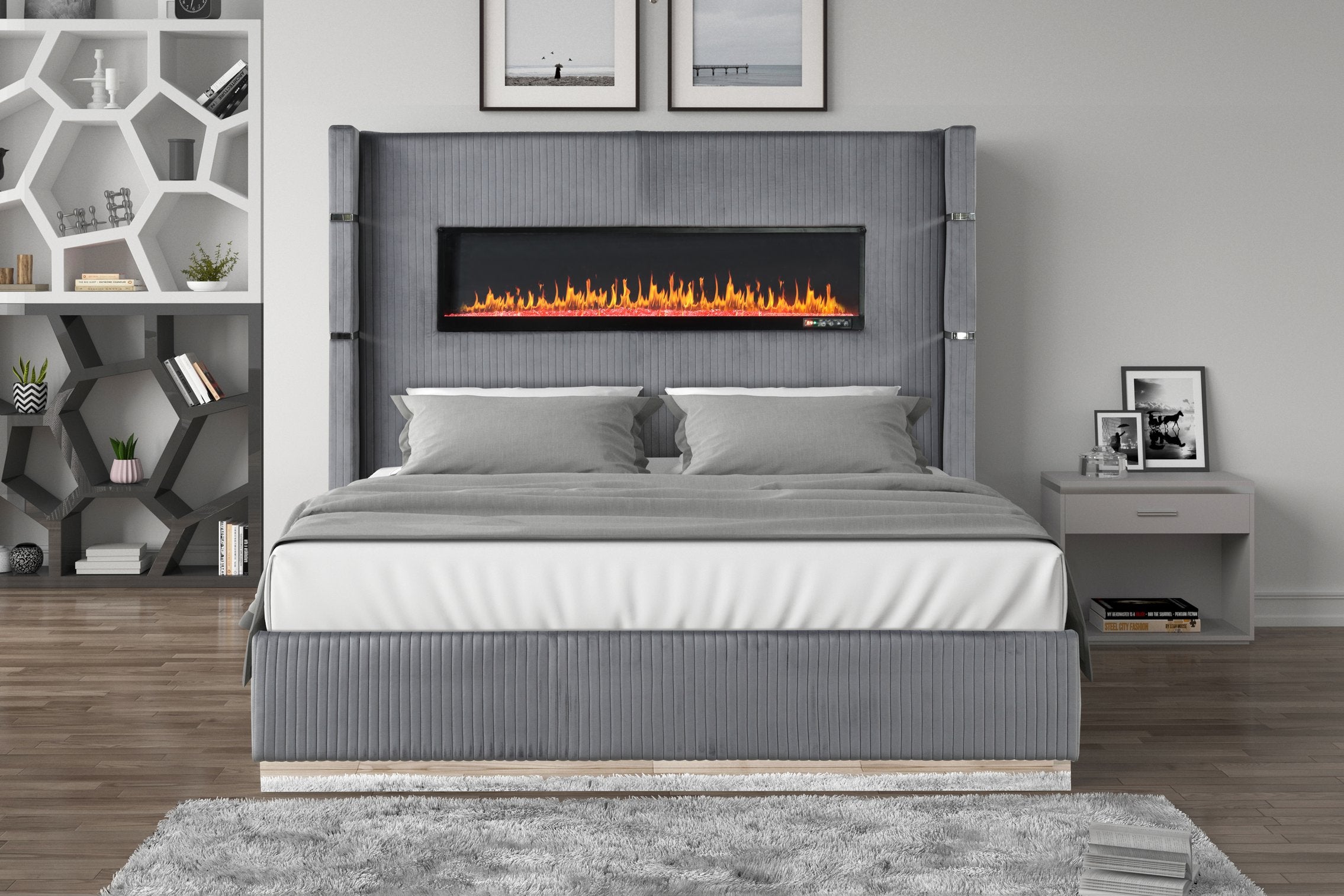 Bring modern luxury and smart features to your bedroom with this king-size upholstered bed in a sophisticated gray velvet finish. Designed to combine style, technology, and comfort, it delivers a striking focal point with a plush tall headboard, ambient fireplace display, integrated connectivity, and fine upholstery details for a refined, contemporary look.