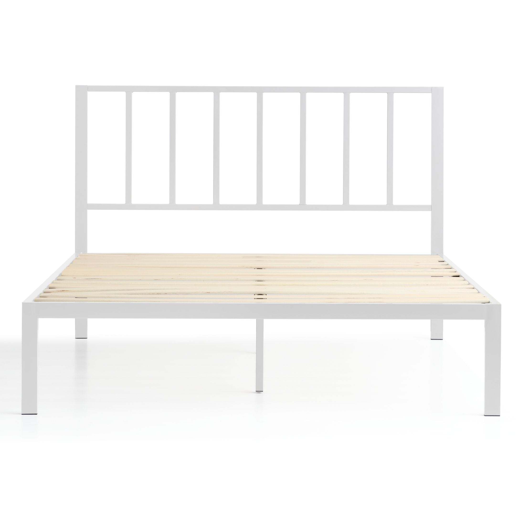 Bring modern minimalism and reliable support to your bedroom with this white metal platform bed featuring a clean vertical bar headboard. Designed for easy assembly and everyday durability, the frame pairs powder-coated steel with wooden slats to support your mattress without the need for a box spring. The king size model adds reinforced center support for long-lasting stability and even weight distribution, making it an ideal choice for a sleek, low-profile sleep solution.